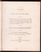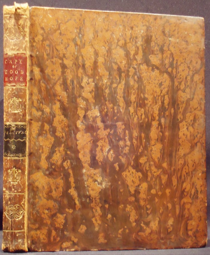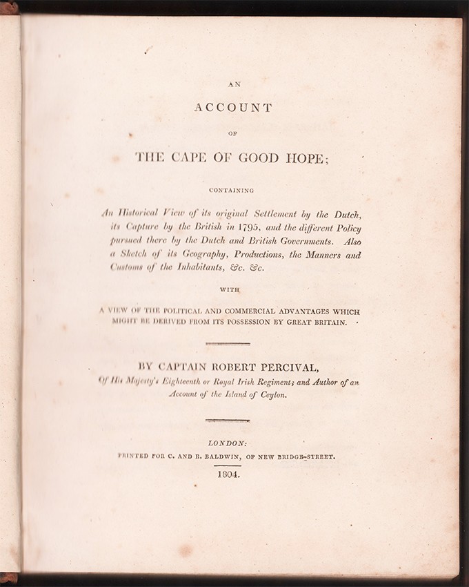 As a captain in the Eighteenth or Royal Regiment of foot, Captain Percival took part in the first British Occupation of the Cape in 1795. Under General Craig he led the attack on the fortifications of Muizenberg, and was the first officer to reach Cape Town. He remained at the Cape for two years. His book was published after the second British occupation in 1805 when there was a renewed demand for more detailed knowledge about the new colony. Theal is very harsh on the book describing it as ‘one of the most unreliable that has ever been issued from the press,’ but it nevertheless provides much interesting detail of the Cape at the time of the first occupation. The present copy is from the first issue with the split heading on page 247 ‘CAPE OF GO ODHOPE’ uncorrected.