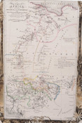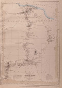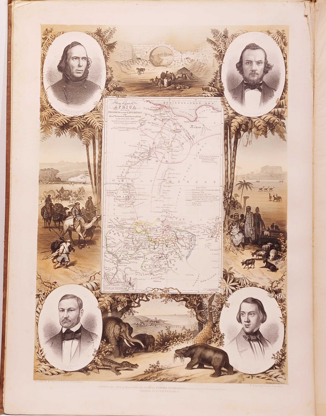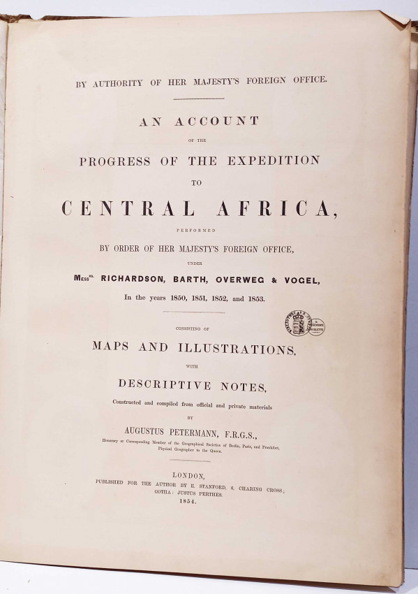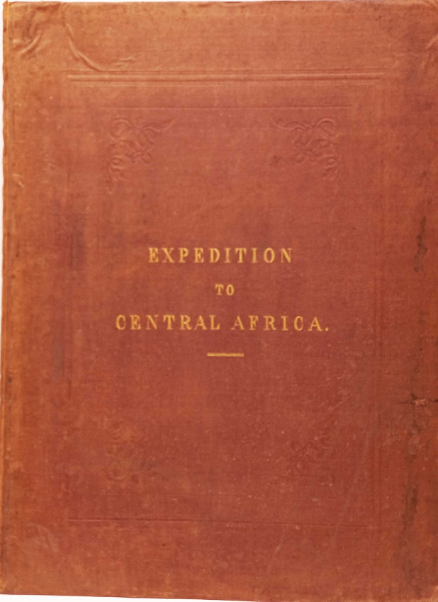 First edition: Elephant Folio, 14 pages of letterpress, tinted lithograph frontispiece with portraits of the four explorers and a map, 2 large lithographed maps – 1 folding of Central Africa, library stamp on the title page, brown cloth boards titled gilt on the upper cover, both covers with blind tooled decoration, starting to wear at the hinges, a good copy.