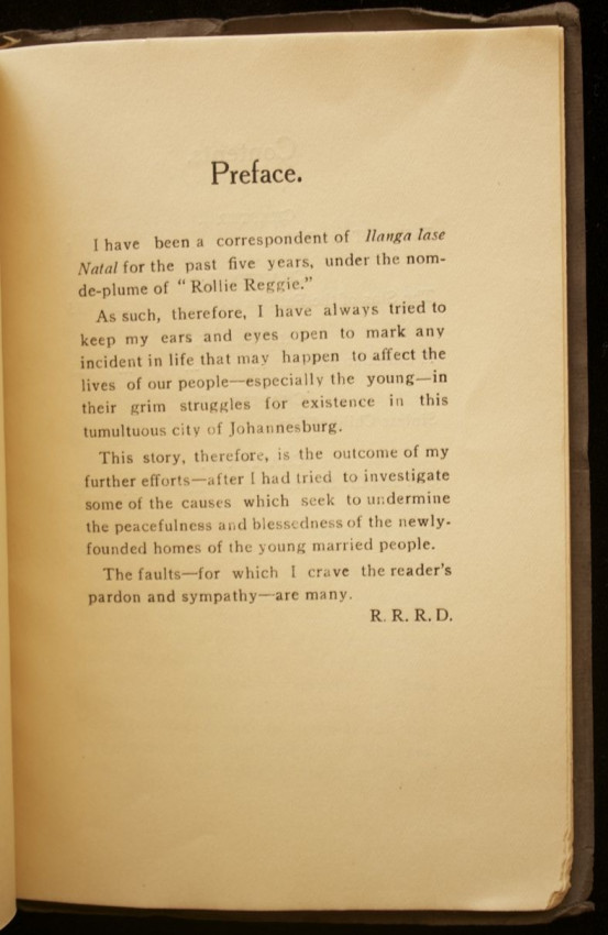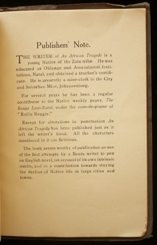 It is generally accepted that Sol Plaatje's epic novel "Mhudi" is the first to be written in English by a black South African writer. Although Dhlomo's 40 page novelette does not match Plaatje's in scale, it does, however, precede it by two years and can rightfully be considered the first work of English fiction by a black South African author published in book form. It is also the first published English novel by a Zulu author.