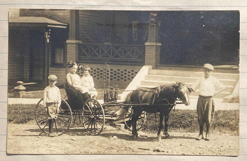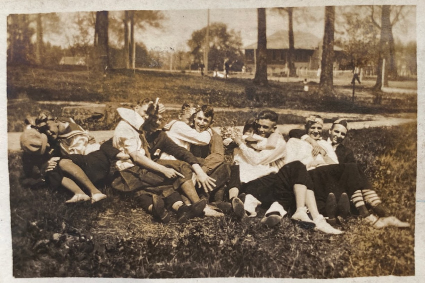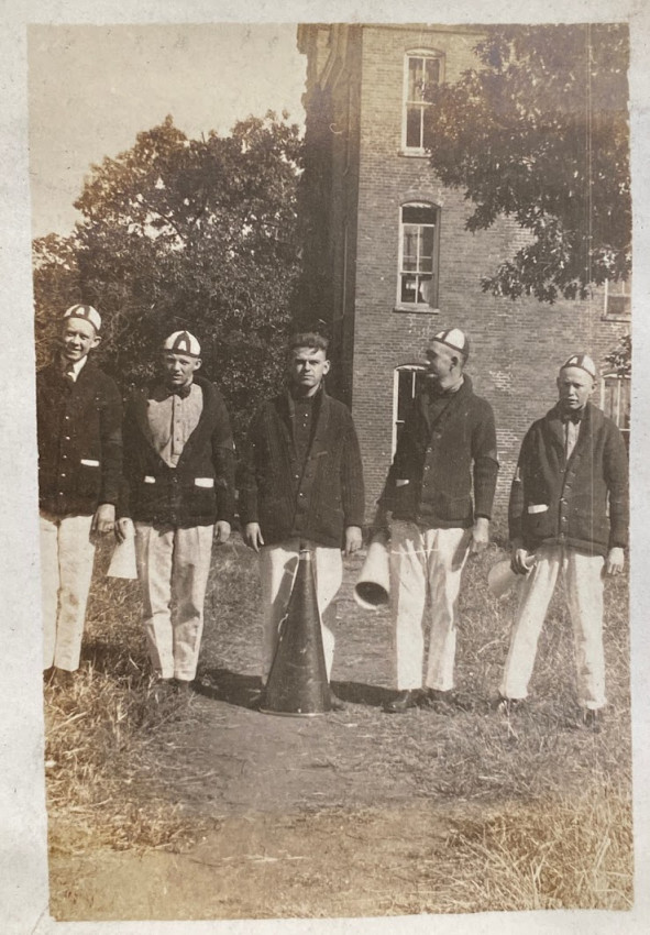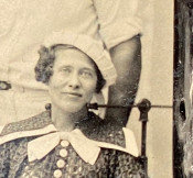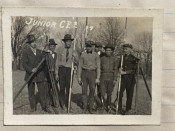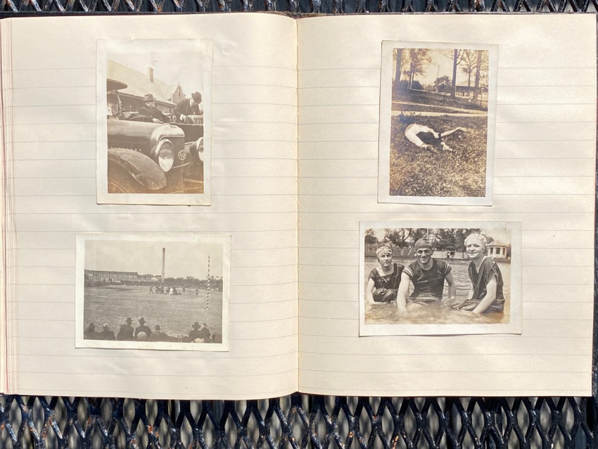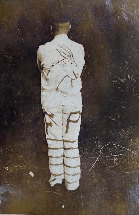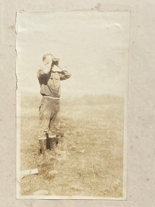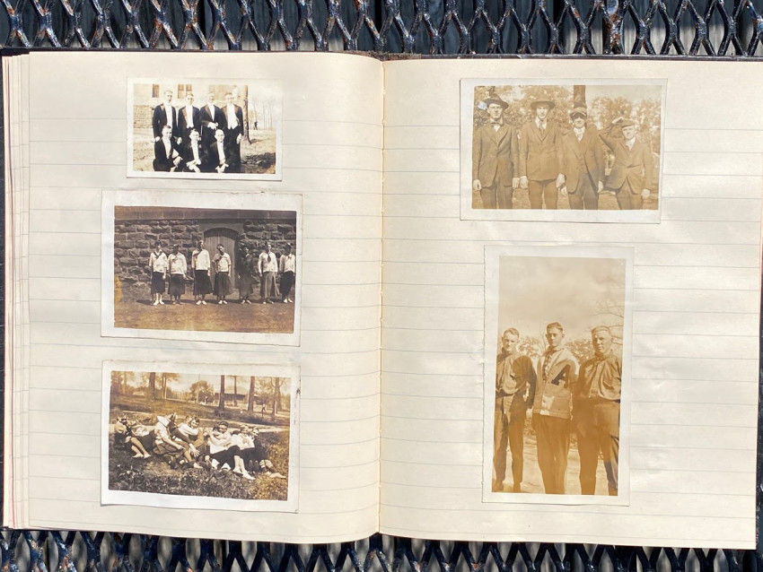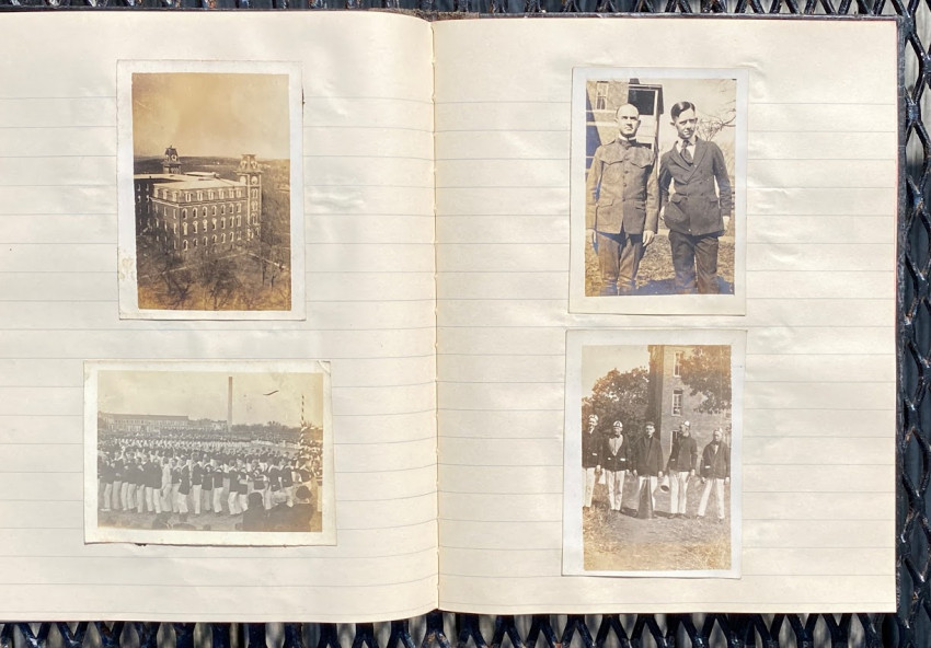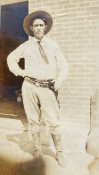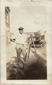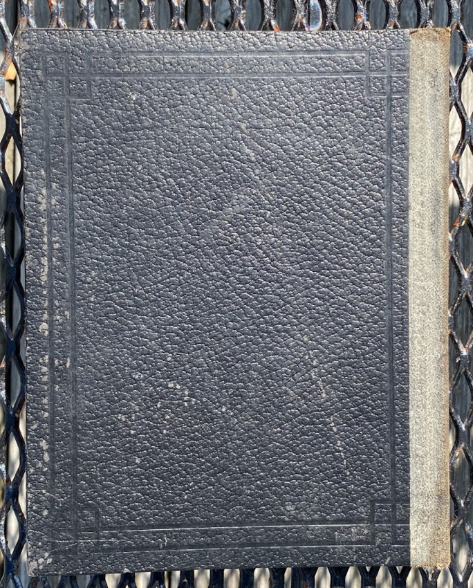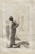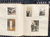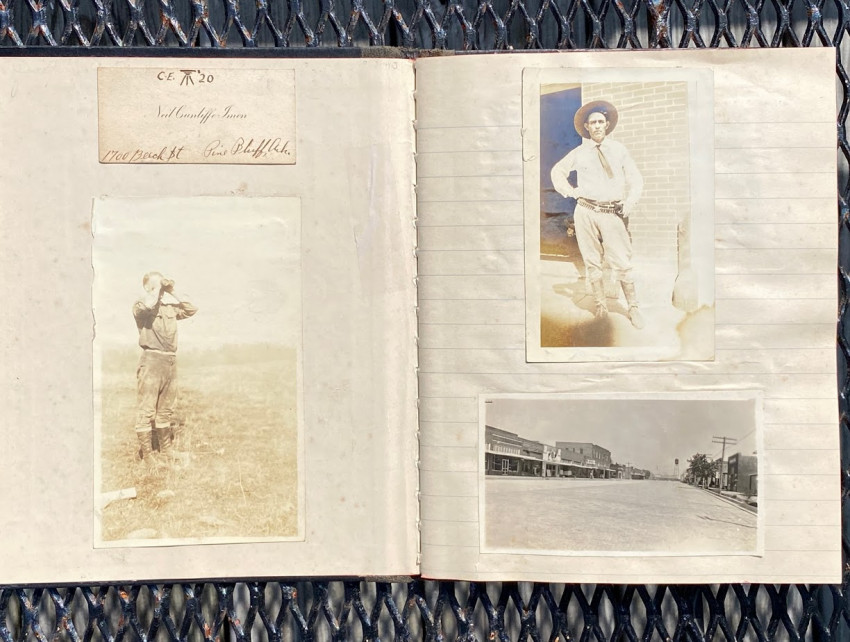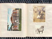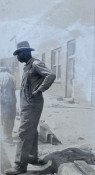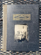 An interesting series: a sheriff(?) in a broad-brimmed hat with gun-belt; 2 images of drillers; 9 of road construction; 3 of surveying; 20 of college life (featuring Imon?). The tintype on the upper cover is interesting: it features at least two support braces (designed to keep people from moving whilst they were being photographed) - these were a regular feature of studio portraits, but the present image is unusual in that absolutely no attaempt has been made to hide the braces!.