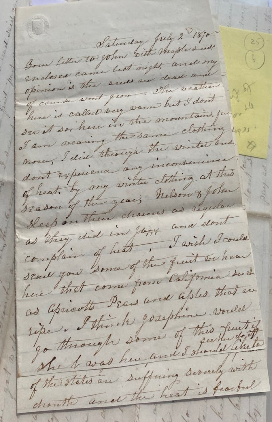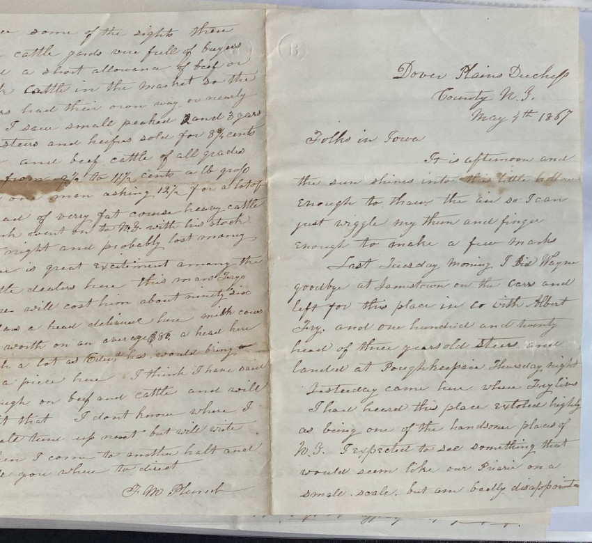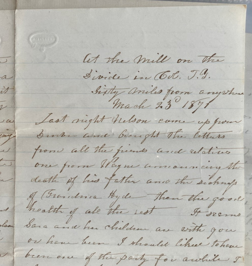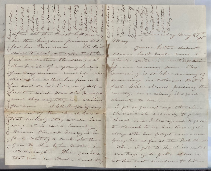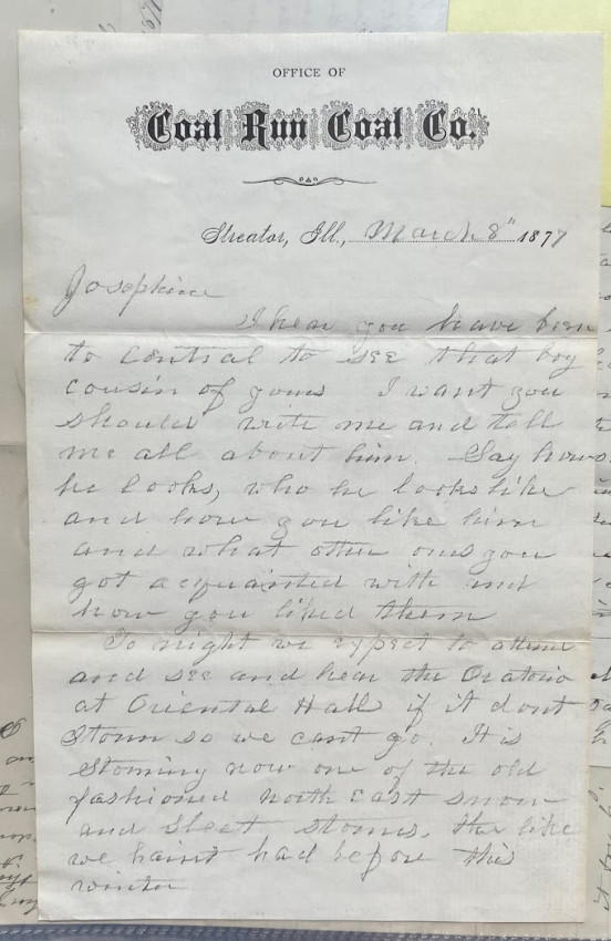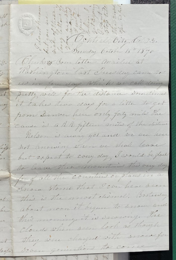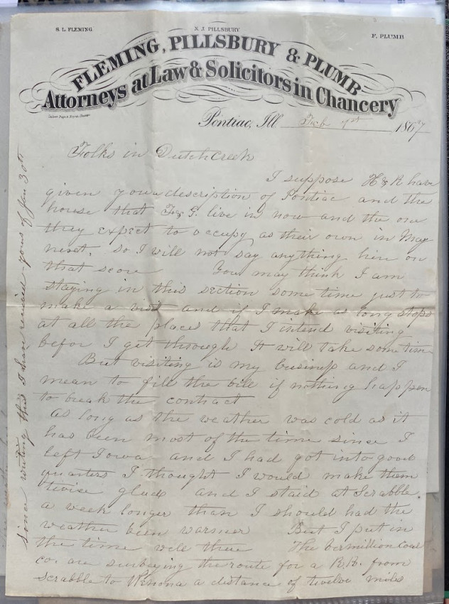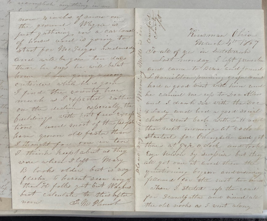 Many, but not all, of the letters include location and date. Chronologically these are as follows: Kinsman, Ohio (March 1852); Pontiac, Illinois (Feb. 1867); Kenosha, Wisconsin (Feb. 1867); Kinsman, Ohio (March 1867); Orangeviille, Ohio (March 1867); Dover Plains, Dutchess Co., NY (May 1867); Patterson, Putnam Co., NY (June 1867); Denver, Colorado Territory (Oct. 1869); Central City, Colorado Territory (Nov. 1869, Jan. 1870, March 1870, Oct. 1870, Nov. 1870); Denver, Colorado Territory (Dec. 1870); "Plumbville on the Divide, El Paso Co., Colorado Territory (Jan. 1871); Denver, Colorado Territory (Feb. 1871); "At the Mill on the / Divide in Col. T.Y. / Sixty Miles from anywhere" (March 1871); Kiowa, Colorado Territory (May 1871); Streator, La Salle Co., Illinois (Feb. 1872); Streator, Illinois (Sept. 1876, Jan. 1877. March 1877); Joliet, Illinois (March, 1884).