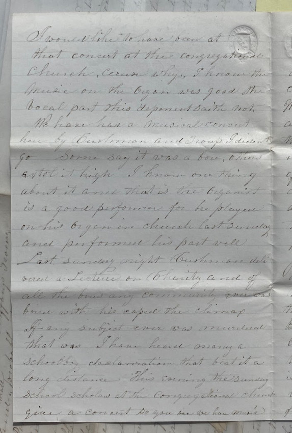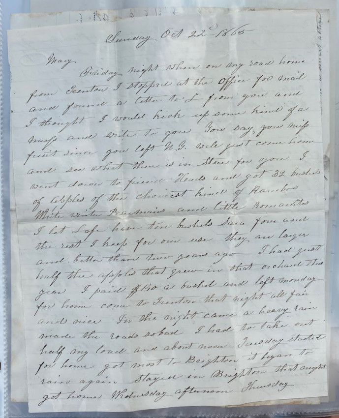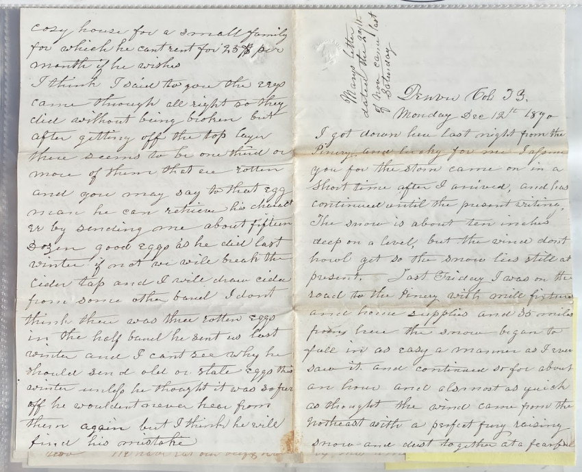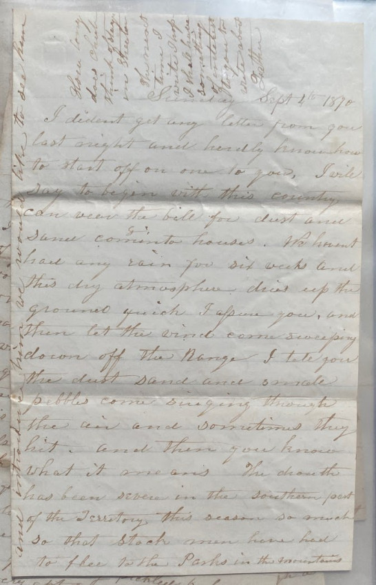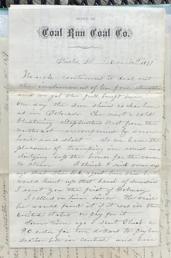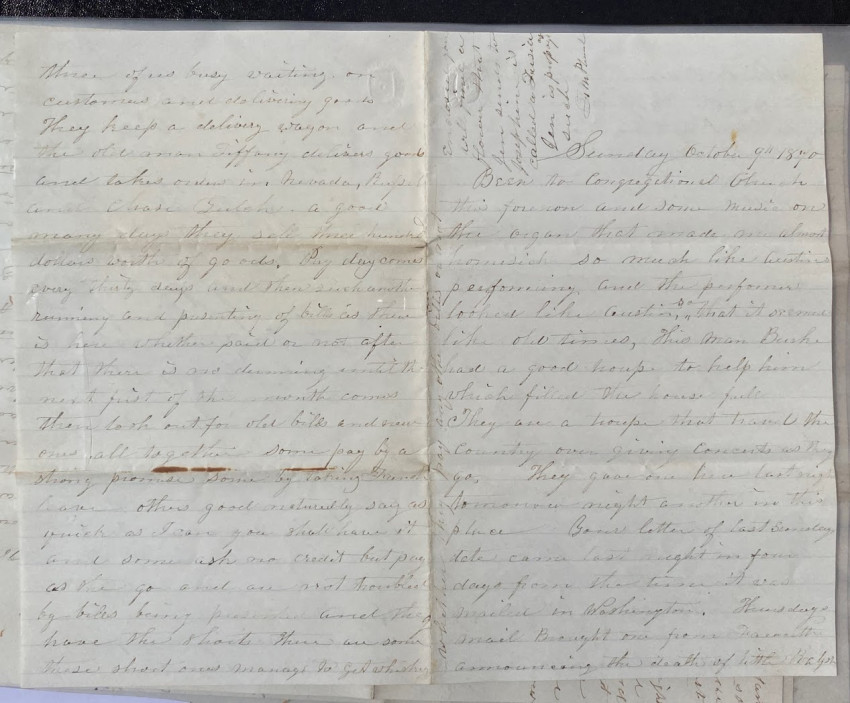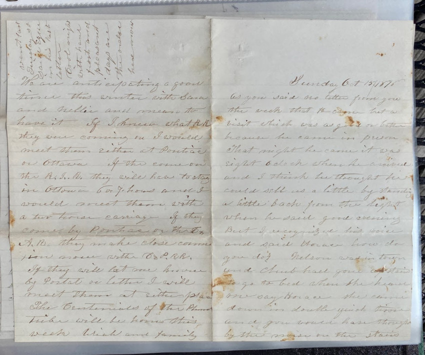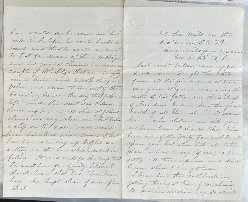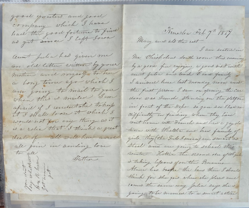 Many, but not all, of the letters include location and date. Chronologically these are as follows: Kinsman, Ohio (March 1852); Pontiac, Illinois (Feb. 1867); Kenosha, Wisconsin (Feb. 1867); Kinsman, Ohio (March 1867); Orangeviille, Ohio (March 1867); Dover Plains, Dutchess Co., NY (May 1867); Patterson, Putnam Co., NY (June 1867); Denver, Colorado Territory (Oct. 1869); Central City, Colorado Territory (Nov. 1869, Jan. 1870, March 1870, Oct. 1870, Nov. 1870); Denver, Colorado Territory (Dec. 1870); "Plumbville on the Divide, El Paso Co., Colorado Territory (Jan. 1871); Denver, Colorado Territory (Feb. 1871); "At the Mill on the / Divide in Col. T.Y. / Sixty Miles from anywhere" (March 1871); Kiowa, Colorado Territory (May 1871); Streator, La Salle Co., Illinois (Feb. 1872); Streator, Illinois (Sept. 1876, Jan. 1877. March 1877); Joliet, Illinois (March, 1884).