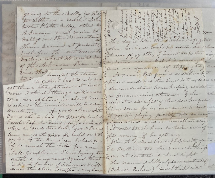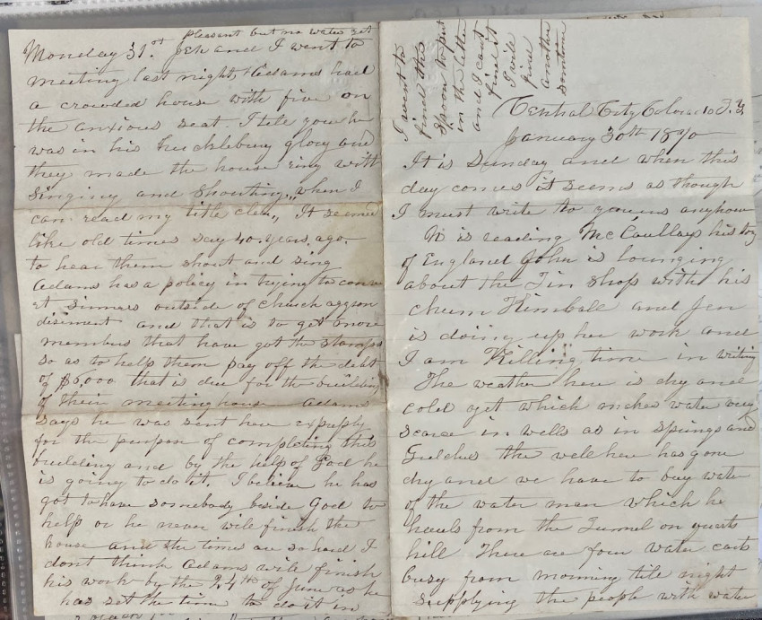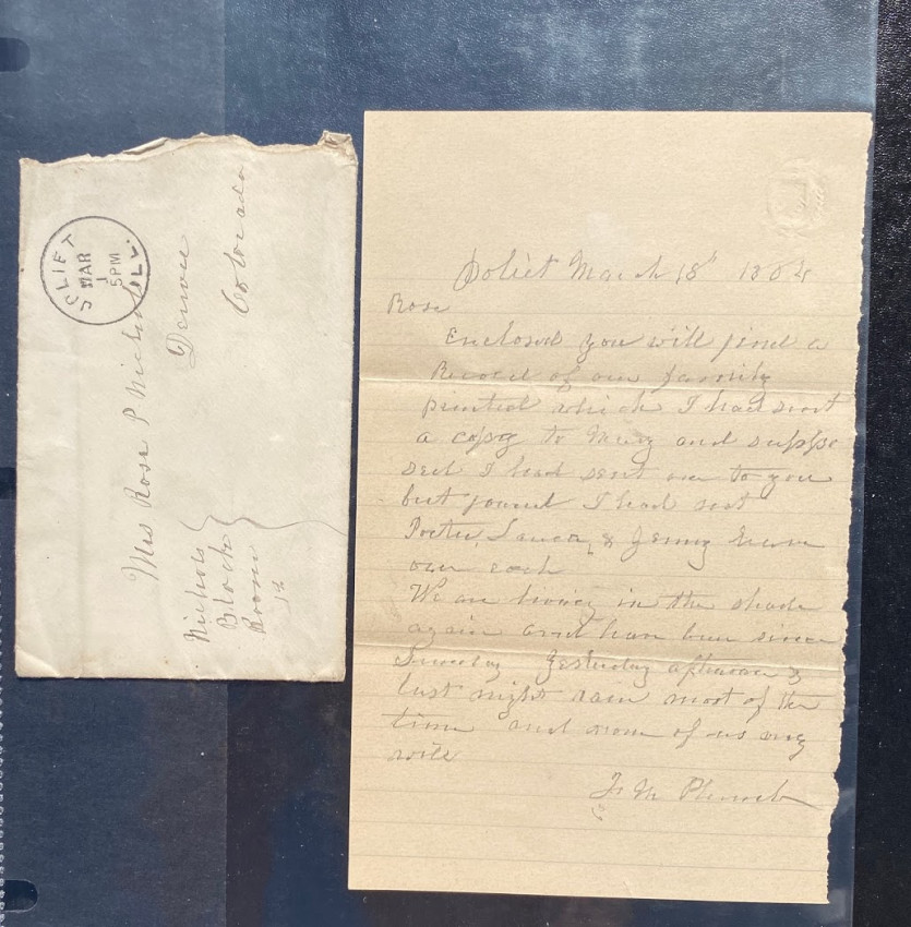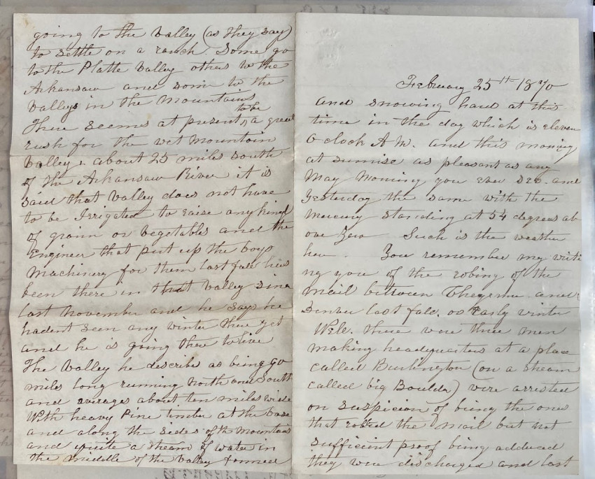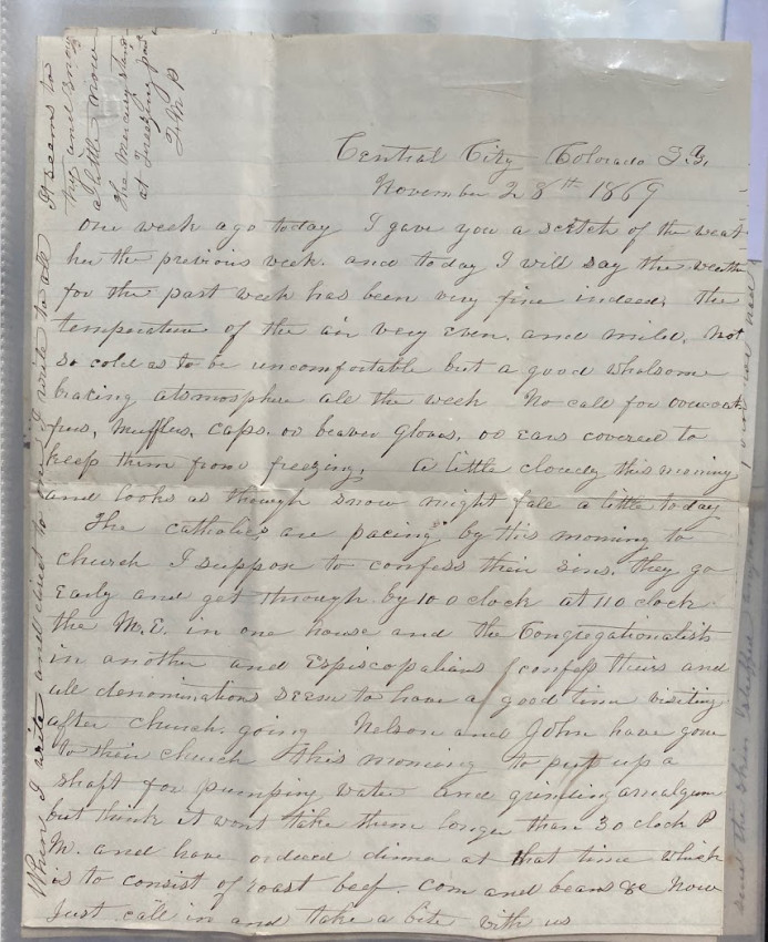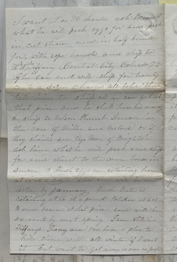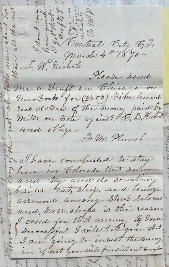 The most important group, dating betweem October 1869 and March 1871, are written by Francis, from Colorado, to various family members as he tries to set up at least two businesses to take advantage of the mining boom in Colorado (initally in Central City). With the help of two of his sons, [Ezra] Nelson Plumb (1833-1911) and John B. Plumb (1844-1921) he sets up a quartz grinding mill, this is followed by a timber mill. The fortunes of both enterprises are perilous: at a certain point John takes a job as a typesetter on the 'Central City Register' (Francis is not impressed by the 'fast-living' lifestyle of the typesetters), but by May 1871 John is back helping with the lumber mill and promising to turn over a new leaf. By early 1872 Francis has moved to Streaor, Illinois, a city which was virtually founded by his brother Ralph Oberlin Plumb (1816-1903).
