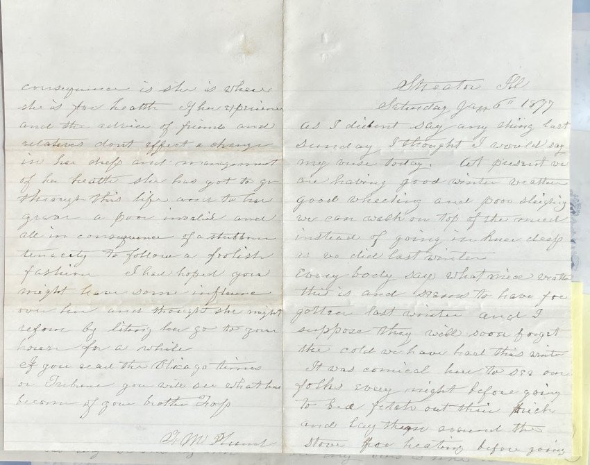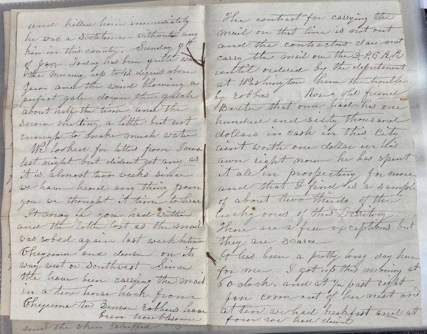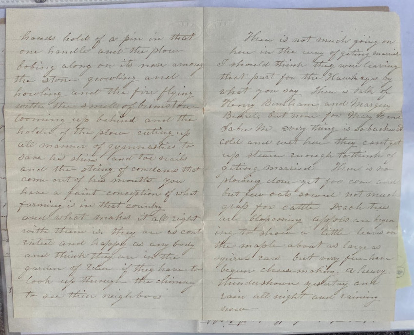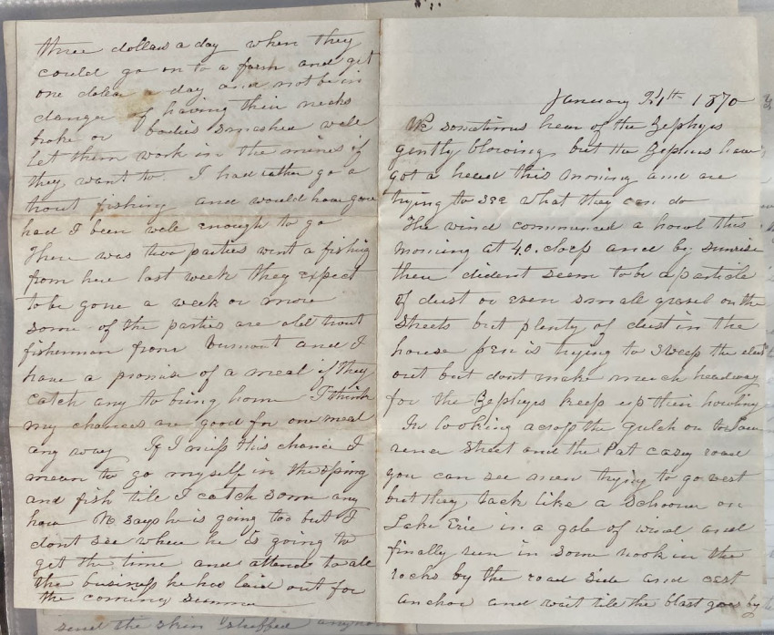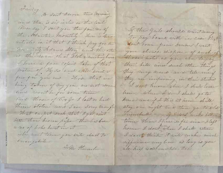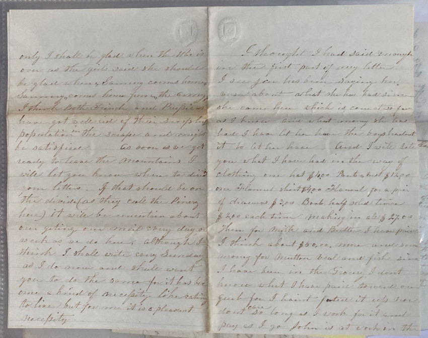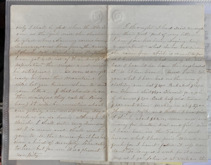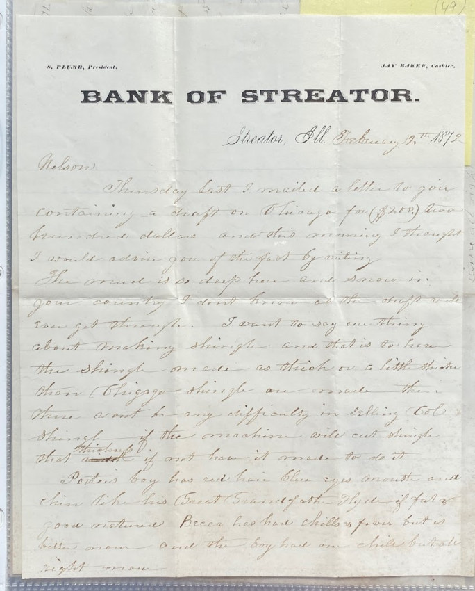 The most important group, dating betweem October 1869 and March 1871, are written by Francis, from Colorado, to various family members as he tries to set up at least two businesses to take advantage of the mining boom in Colorado (initally in Central City). With the help of two of his sons, [Ezra] Nelson Plumb (1833-1911) and John B. Plumb (1844-1921) he sets up a quartz grinding mill, this is followed by a timber mill. The fortunes of both enterprises are perilous: at a certain point John takes a job as a typesetter on the 'Central City Register' (Francis is not impressed by the 'fast-living' lifestyle of the typesetters), but by May 1871 John is back helping with the lumber mill and promising to turn over a new leaf. By early 1872 Francis has moved to Streaor, Illinois, a city which was virtually founded by his brother Ralph Oberlin Plumb (1816-1903).