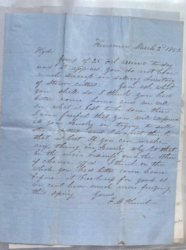 Letters not by Francis Plumb: Hyde Plumb (d.1854: Findlay, Hancock Co., Ohio writing to his father Francis Plumb [Nov. 1853])