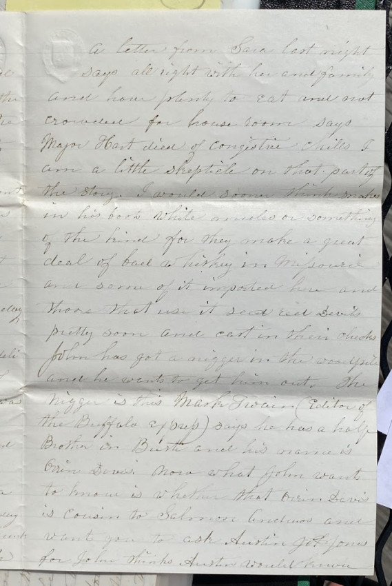 Also, intriguingly, in a letter dated 'Central City ... October 16th 1870' Francis mentions Samuel Clemens: "John has got a n..... in the woodpile and he wants to get him out. The n..... is this Mark Twain (Editor of the Buffalo Express) says he has a half Brother in Busti [Chautauqua County, N.Y.] and his name is Orrin Davis. Now what John wants to know is whether that Orrin Davis is cousin to Salomon Andrews and wants you to ask Austin... Jones for John thinks Austin would know."