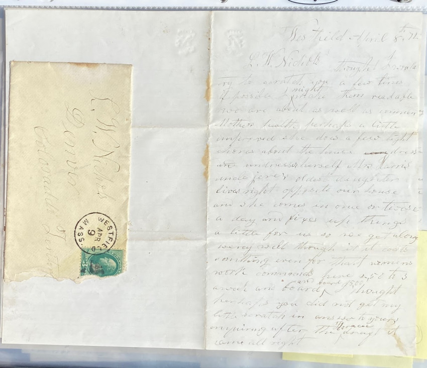 Mr. Nichols, L.W. Nichols father. from Westfield, Mass., family news. L.W. Nichols was Francis Plumb's son-in-law (April 1872)