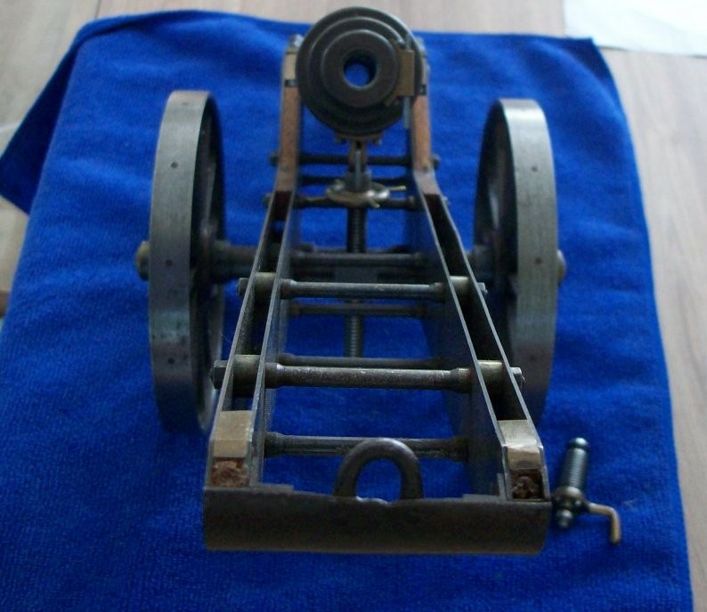 This model originally stood in a mahogany and glass case, with silver identification plaque. The glass case has gone and only the display base with the identification plaque remains to support the model. There is ab identification mark stamped on the left side of the carriage stating reproduction of " Long Cecil " made in Kimberly South Africa during The Siege 1899-1900. Scale 1:12