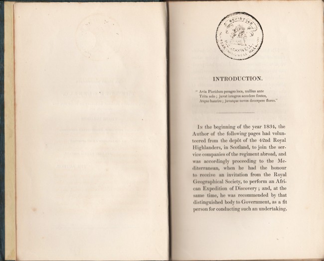 2 volumes: xxiii,302 + viii,306 pages, engraved frontispieces in each volume, folding map, 6 engraved plates and 7 engravings in the text, original light blue cloth, blind decorated on the upper cover and titled and decorated gilt on the spines. Volume I has been rebacked preserving the original back strip, the lower hinge of volume II has been repaired. The original endpapers have been preserved. The plates are oxidised as is often the case with the associated off-setting on the facing pages, otherwise the contents are bright. Page edges uncut. Private library stamps on each title and following page, book plate of Norman Owen Howell on each front paste-down endpaper.