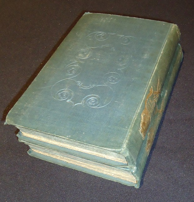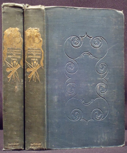 2 volumes, xxiii, 302 + viii, 306 pages followed by 6 pages of the publisher’s catalogue, engraved frontispieces in each volume, folding map – repaired at the folds, 6 engraved plates and 7 engravings in the text, original blind stamped blue straight grained cloth, titled and decorated gilt on the spines, edges uncut, original endpapers intact. The plates are oxidised in the margins as is often the case and with the associated light off-setting on the facing pages, otherwise the contents are bright. The bindings are leaning out of square. Overall a very good set.