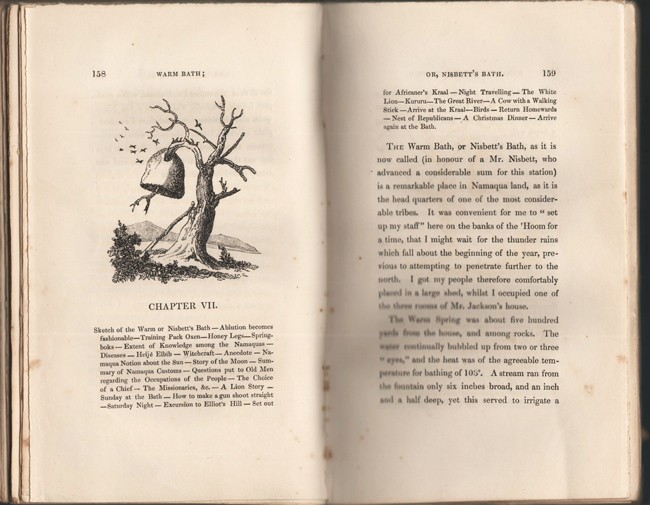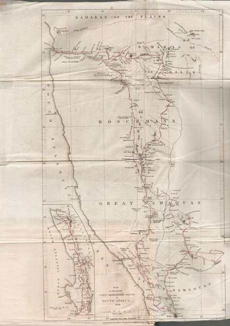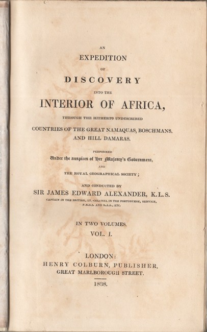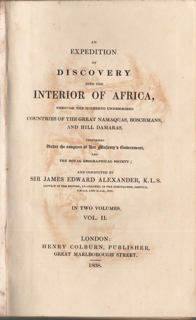 Mendelssohn (S.) South African Bibliography, 1:20-21: 'He proceeded to Namaqualand and Damaraland, which countries were very little known at the time. Leaving Cape Town in 1836, he traversed these regions in an ox wagon, and went through a large part of South West Africa arriving at Walvisch Bay almost exhausted with the difficulties of travel and want of water. He succeeded in obtaining a good collection of zoological and other specimens, many of which were at that time unknown to the scientific world. The volumes contain an account of the social condition of the Namaquas, Bushmen and Damaras.'