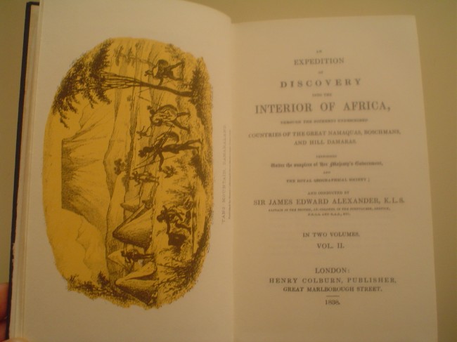 Sir James Alexander fully intended carrying out his intention of exploring part of Eastern Africa, but as he was forestalled by Dr. A. Smith he decided to pursue his investigations in the West. With this view he proceeded to Namaqualand and Damaraland, which countries were little known at this time. Leaving Cape Town in 1816, he traversed these regions in an ox waggon, and went through a large part of the country now known as German West Africa, arriving at Walvisch Bay almost exhausted with the difficulties of travel and want of water. He draws attention to the education of the natives by the missions, through the medium of the Dutch language, which he considers a mistake, and states that the Damaras have no religious belief. He had a good deal of hunting throughout his journey, and was successful in providing food for his large party. He succeeded in obtaining a good collection of zoological and other specimens, many of which were at that time unknown to the scientific world. The volume contains an account of the social conditions of the Namaquas, Boschmans, and Damaras, several illustrations, a map of the route of the author's expedition, and the Appendix includes a note upon the Cape Colony.