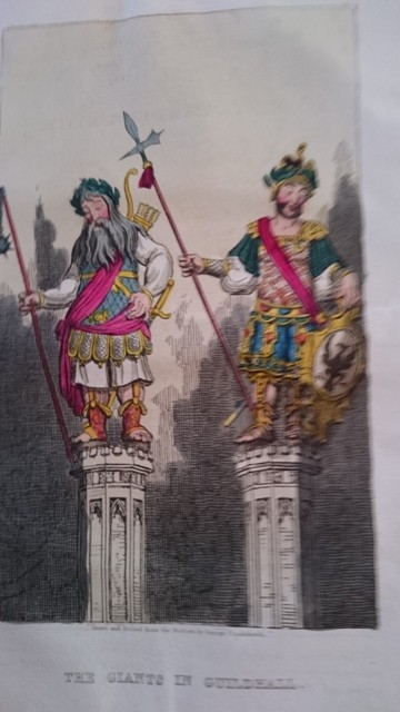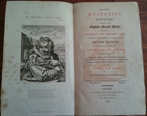 First Edition 1823, Privately printed for William Hone, Ludgate Hill, London. Octavo, 14.5 x 23cm; x [2] 299 [6]. Original paper boards with title to spine. Uneven edges. Title page in red and black print. Illustrated with 4 copper engravings: one, the frontispiece; one – Giants in Guildhall – hand coloured; and one a foldout – Hearne’s Descent into Hell: and 9 wood engravings. Two of these are by George Cruikshank.