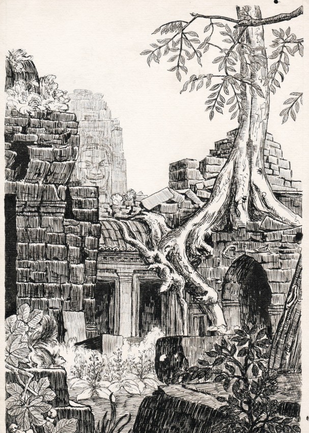 Original pen-and-ink drawing of the extensive ruins at Angkor, from which several plates in the artist-author's book 'Angkor Ruins in Cambodia' (London: Grant Richards, 1923 / Boston: Houghton Mifflin, 1924) were produced.