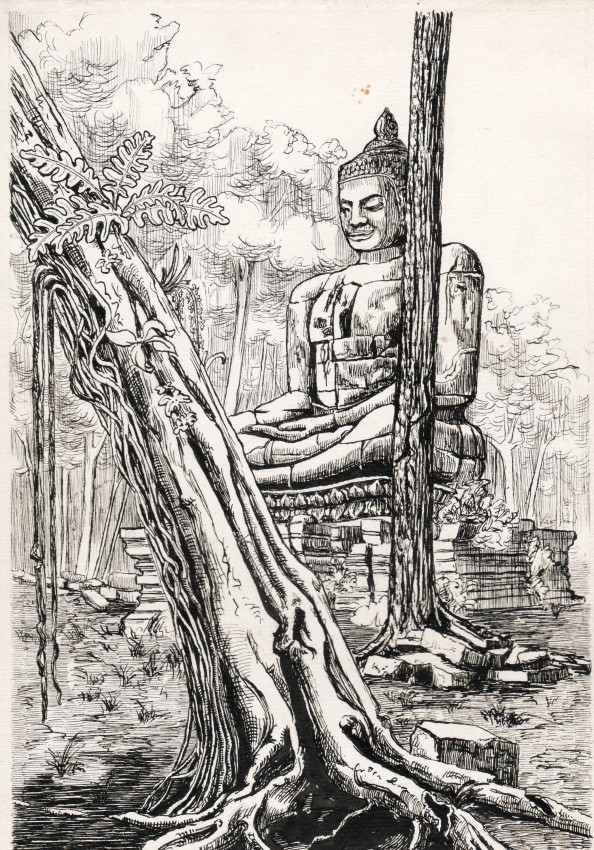 In 1860, the botanist Henri Mouhot reported that he had discovered extensive ruins in Cambodia. Before he died of fever in Laos, the world knew of the temples described by expert on Khmer civilisaton Dawn F. Rooney as transcending "the boundaries of anticipated beauty." Pierre Jeannerat de Beerski's original drawings for his work Angkor Ruins in Cambodia capture a sense of Mouhot's moment of discovery: here are imposing statues besieged by foliage, and ornate stonework crumbling beneath fig and kapok trees, long before the tourist invasion.