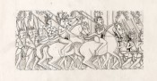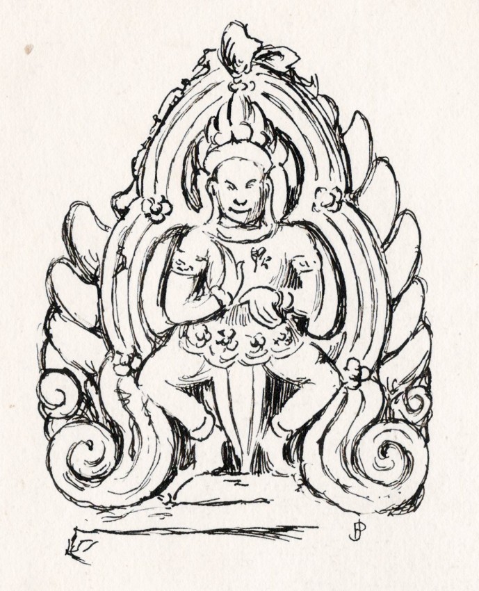 Also included are: 5) Boar (Figure 19), sheet size: 138 x 105 mm, image size: 38 x 58 mm; 6) Detail from fallen pediment, Bayon, sheet dimensions: 140 x 120 mm, image dimensions: 85 x 65 mm; 7) Scene with bull and elephant, sheet dimensions: 110 x 150 mm, image dimensions: 82 x 116 mm; 8) Jugglers (Figure 13), sheet size: 115 x 203 mm, image size: 85 x 100 mm; 9) Dancing Apsaras, Prah Khan (Figure 40), sheet size: 160 x 120 mm, image size: 90 x 110 mm; 10) Scene of infantry and armed riders, sheet dimensions: 310 x 150 mm; 11) The Leprous King (Figure 29), sheet size: 140 x 203 mm, image size: 95 x 70 mm; 12) A noble from the decoration of the Leprous King's Terrace (Figure 28), sheet size: 225 x 203 mm, image size: 95 x 75 mm; 13) Openwork stella found near Takeo (Figure 34), sheet size: 185 x 200 mm, image size: 110 x 80 mm; 14) Commoners (Figure 14), sheet size: 104 x 203 mm, image size: 53 x 124 mm; 15) A Happy Father (Figure 15), sheet size: 150 x 97 mm; image size: 60 x 35 mm; 16) Figurine (Figure 63), sheet size: 138 x 100 mm, image size: 55 x 50 mm. Trace of surface dirt. Very good condition.