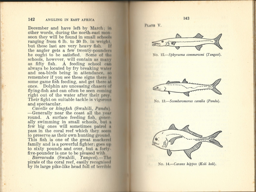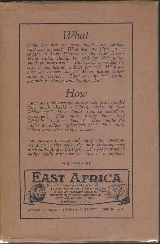East Africa Ltd., London 1933, xi adverts + 195pp + xiv pp adverts. 5 maps in end pocket, 8 woodcut illustrations, index. 'Angler's Diary' (blank), bibliography : coarse, sea & game fishing, tackle & outfits, cooking fish, etc. A near fine hardback copy in a near fine and scarce dust jacket. Some foxing to the text block edges.