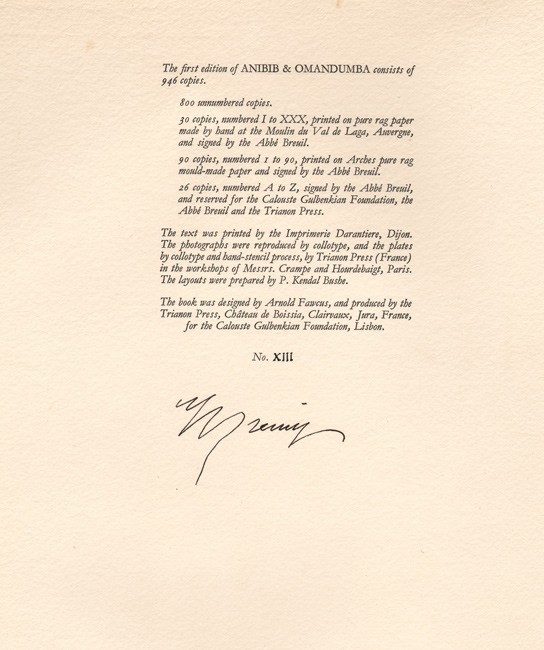 30 copies numbered I to XXX, printed on pure rag paper made by hand at the Moulin de Val de Laga, Auvergne, and signed by Abbé Breuil.
