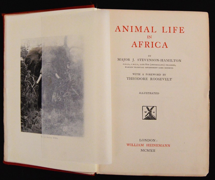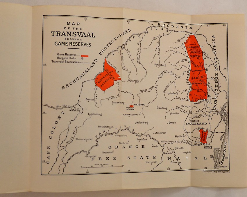 First edition of this classic title. A large volume of 529pp. plus prelims and index. With numerous black and white illustrations and 6 maps, two of which are folding and in fine condition. In the original red cloth with silver titling and map on the front cover. Fore and lower edges uncut.Czech: An annotated Bibliography of African Big Game hunting Books, 1785 to 1999, pages 266-7,‘The author, warden of the Transvaal Government Game Reserves, describes in detail all manner of African wild life including elephant, lion, rhinoceros, buffalo and a host of antelope species. In his chapter on the lion, Stevenson-Hamilton describes a gruelling duel between Harry Wolhuter, a ranger of the game reserve, who used a hunting knife to slay a lion which was attacking him. There are numerous other incidents of hunting game both by the author and other sportsmen in Africa.’
