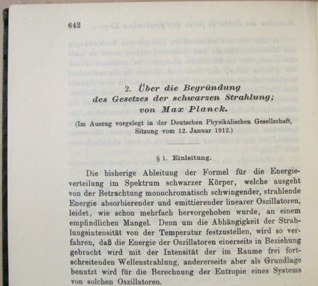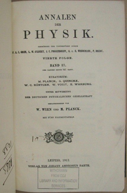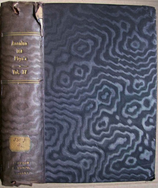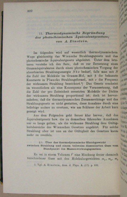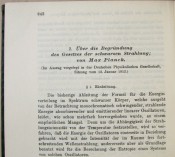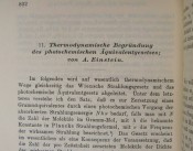 Black cloth boards with gilt titling on the spine. Cream coloured end papers. The Seymour Memorial Library book plate on the front paste down. viii prelims, 1048 pages, 5 full page illustrations, of which 4 fold out, many in text illustrations. Aside from the article on thermodynamics by Einstein, there is also an article by Max Planck on \"...Gesetzes der schwarzen Strahlung.\"