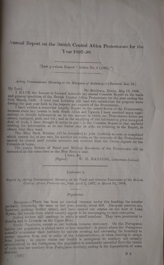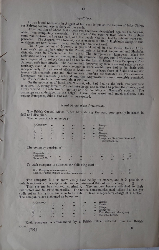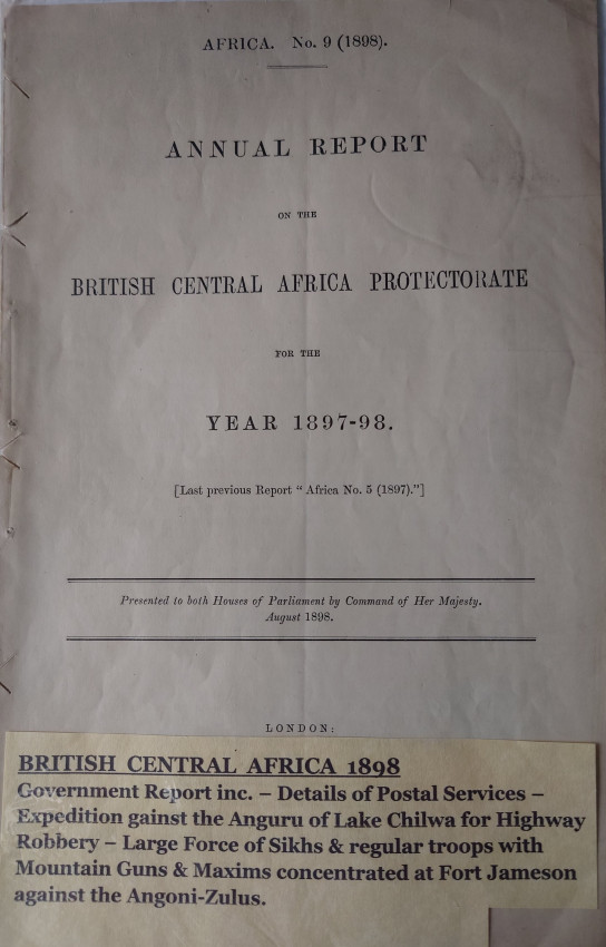 Government report 1898 on the details of postal service, the expedition against the Anguru of Lake Chilwa for Highway Robbery, The large force of Sikhs and regular troops concentrated at Fort Jameson, etc