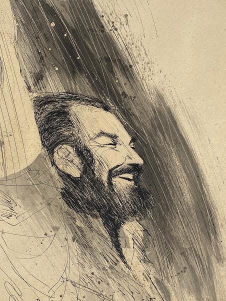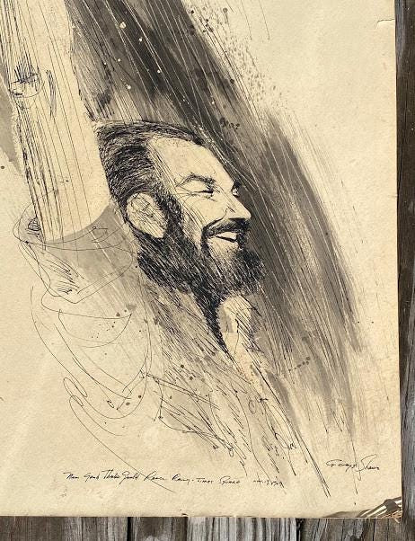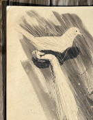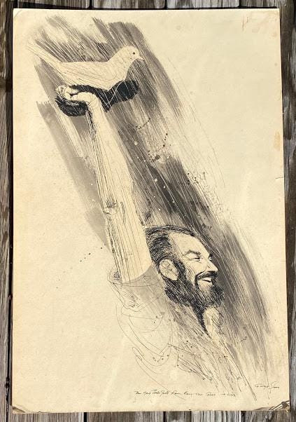 A joyful and spirited rendition of an iconic UPI photograph of the celebrated folk singer and activist Pete Seeger. The moment is described as: “A dove of peace returns to folk singer Pete Seeger's hand shortly after the releasing of 12 such birds during New York Theater Guild peace rally today in Times Square in New York City. — UPI, Nov. 13, 1969”. The image appears to have been produced as an illustration, but we do not know if it was published.