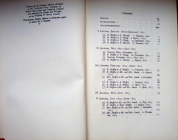 Presentation edition, Oppenheimer Series, Number Five, limited to thirty-five copies, of which this is number 7, Government Archives of Southern Rhodesia, I.Schapera (editor), 307 pages, leather binding, gilt edging, uncut, illustrated with plates & maps, 260 x 180mm, condition; very good.