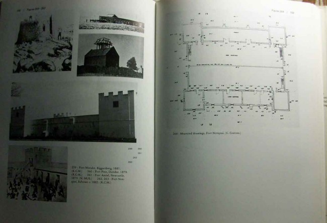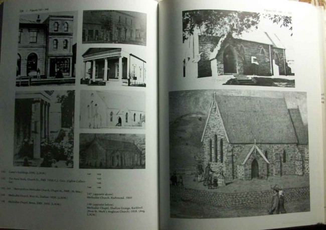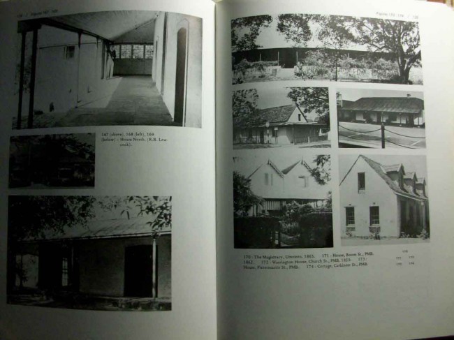 What is known of early settler homes is followed by an account of the houses and public buildings of the early colonial period: wayyle and daub walls, grass thatch, clay and cowdung floors, hipped roofs--and verandas. "The advent of the veranda" says Kearney. " marks the transition in Natal from the Dutch to the English colonial tardition." There are detail descriptions of styles and practices of the British settlers (1849-56) and of the more ambitious developments that followed(1856-79).
