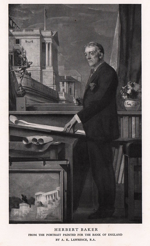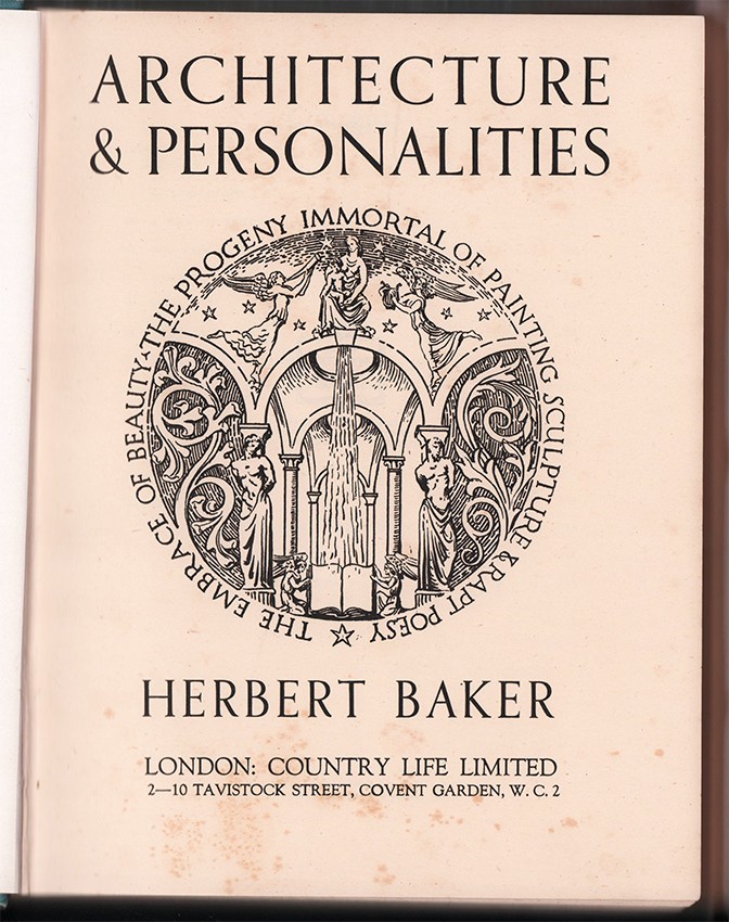 224 pages, frontispiece portrait of Herbert Baker, plans, sketches and numerous illustrations, embossed blue cloth, some spotting on the edges, a good copy in slightly soiled dust jacket now preserved in a protector.