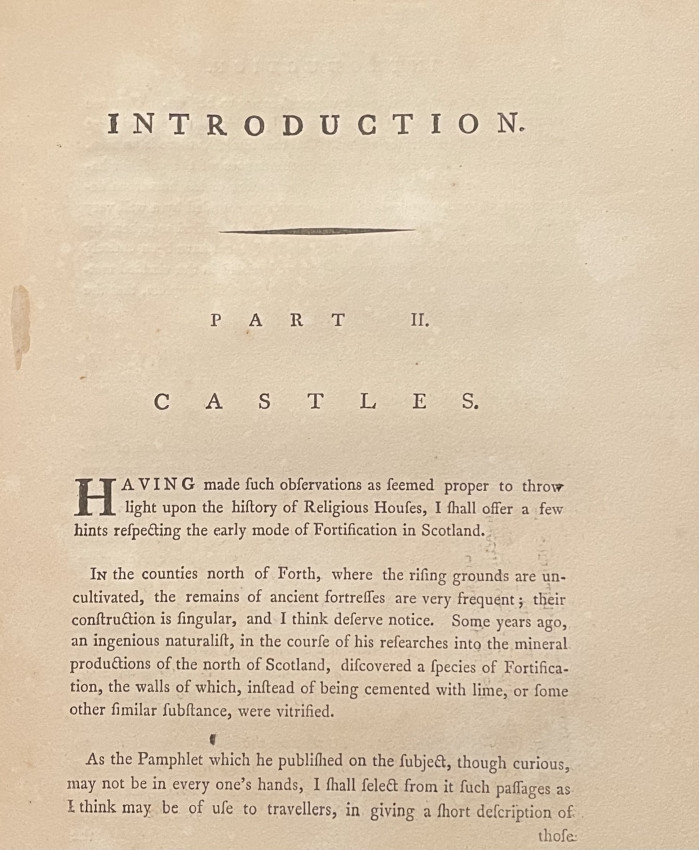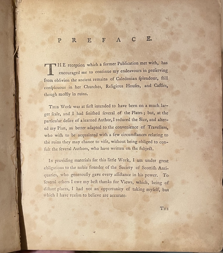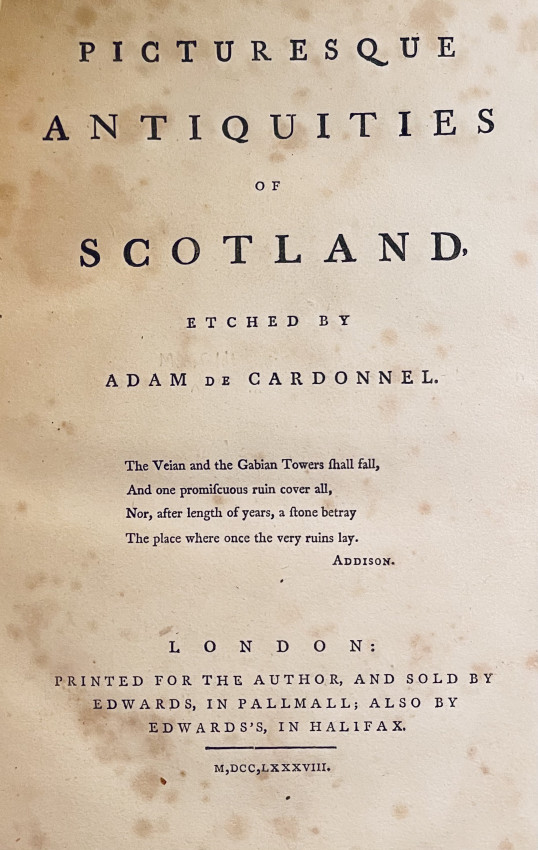 “Picturesque Antiquities of Scotland Etched by Adam de Cardonnel" is a book that features illustrations of historical and architectural landmarks in Scotland, etched by Adam de Cardonnel. The book was printed for the author in 1788 and sold by Edwards in Pall Mall and Halifax.