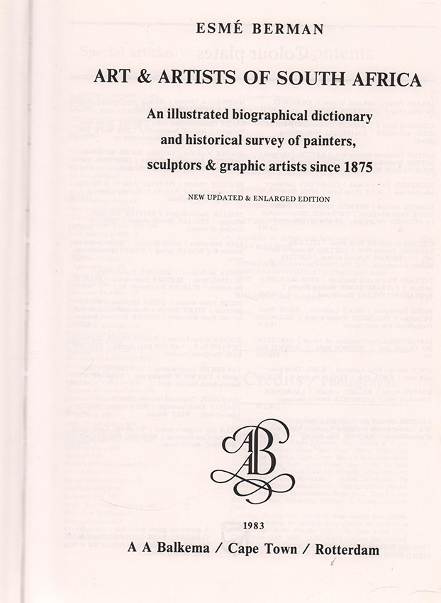 Editor's note. 'Art and Artists is the most comprehensive reference work on South African art yet published. In addition to more than 400 biographies on individual artists - 210 of them in depth - there are over 100 articles on museums and institutions, art groups and associations, styles and media, exhibitions and events. The book explores the developments in South African art and recalls the early activity in each of the main centres. It examines various classes of painting, graphic and sculptural expression and lists the leading exponents in those fields. It gives attention also to a wide range of related topics such as Art Periodicals, Collections, Fame and Promise, Forgeries, National Competitions, Reproductions, Rock Art, etc.'