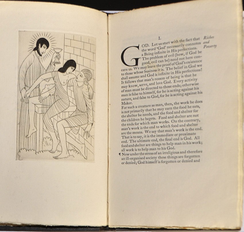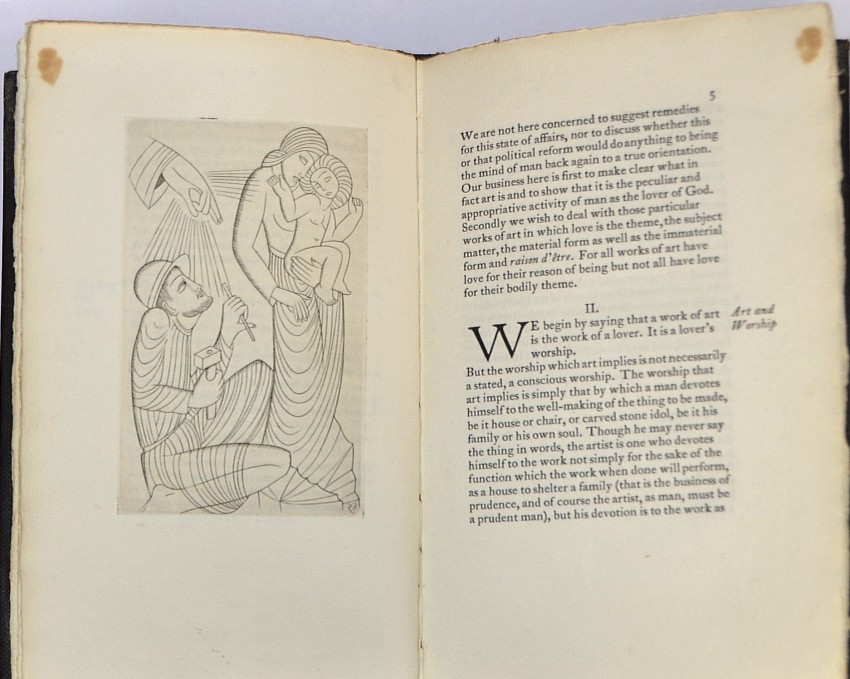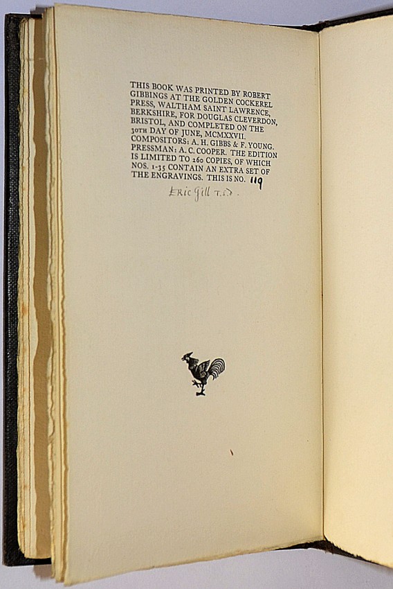 No. 119 of 260 copies signed by Eric Gill with 6 full page engravings by him. A very good copy in the original black cloth. From the prestigious library of C.S. (Punch) Barlow, with his leather ex libris on the front pastedown which has offset slightly on to the opposite blank free endpaper. Pages 3 to 6 have approximately 1cm. round circular stains in the top margins (see image), not affecting the text or the illustrations. Apart from this the book is clean and unmarked.
