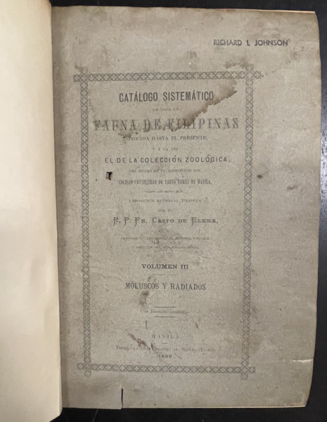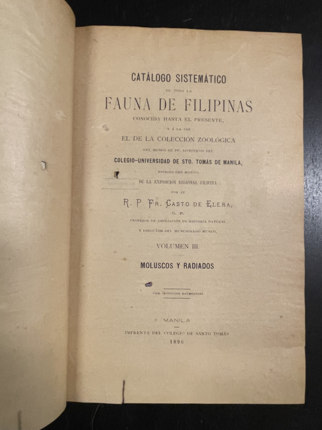 Casto de ELERA. Catálogo sistemático de toda la fauna de Filipinas conocida hasta el presente y a la vez el de la coleccion zoológica del Museo de P.P. Dominicos del Colegio Universidad de Sto. Tomás de Manila. Volume 3. v. 3. Moluscos y radiados.