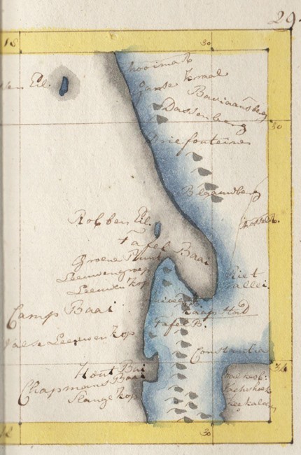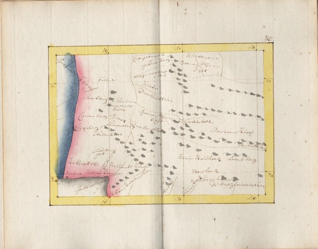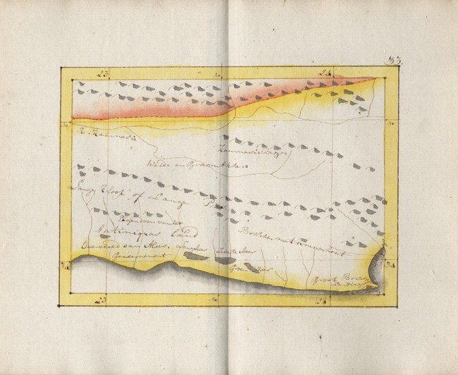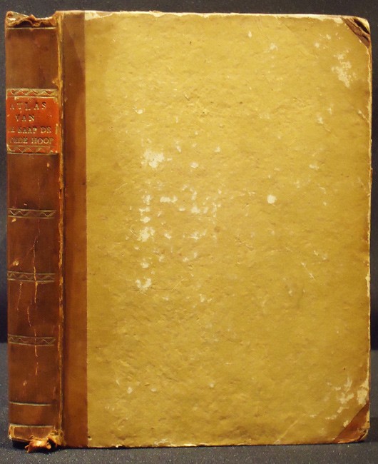 43 manuscript maps comprising a general map of the Cape of Good Hope and 42 maps of the Cape in sequence according to the key marked on the general map, hand coloured and annotated with place names, mountains and rivers. The maps are finely drawn within hand coloured borders showing latitude and longitude, each 232 x 183 mm with a central fold and bound into the album on hinges. Laid paper with what is thought to be the watermark of the Dutch papermaker De Erwen de Blauw but unfortunately the watermark is not complete on any of the pages. Contemporary quarter brown leather with a red title label on the spine, and brown paper sides, bookplate on the front paste-down endpaper and a corresponding small stamp on the manuscript title page. The maps are in excellent condition.