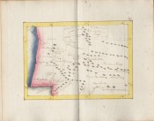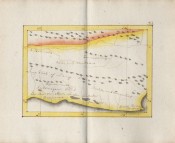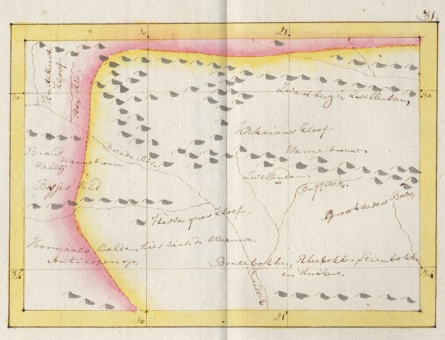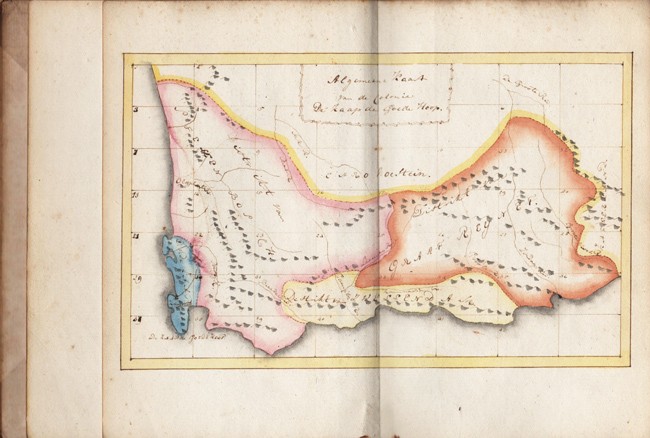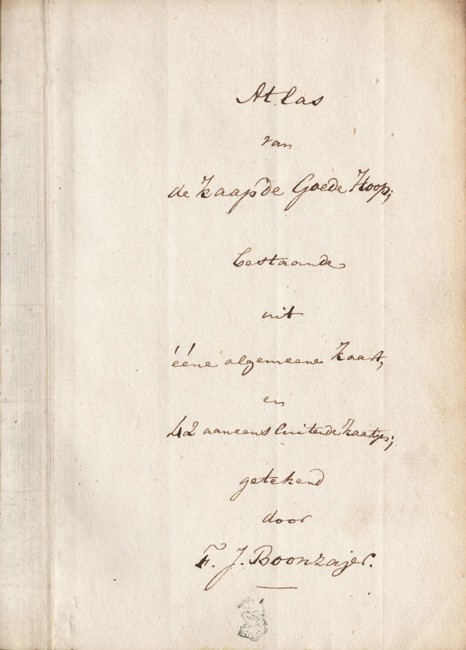 The atlas is not dated but the general map is possibly a copy of the map in Barrow’s Travels (1801-1804) or Bouchenroeder’s Reize in de Binnenland van Zuid-Afrika,1803 (1806). Boonzajer mentions Colonel Gordon’s discovery of the Orange River. Worcester, which was established in 1819, does not appear. Although he has apparently used official survey maps of the time some of the notes do appear to be from actual observation. The maps include extensive notes on game, “De witte Rhinoceros, Springbokken, Hartebeesten en Elanden worden hier veel gevonden.” Also mentioned are vegetation, geology, rock art and farming.