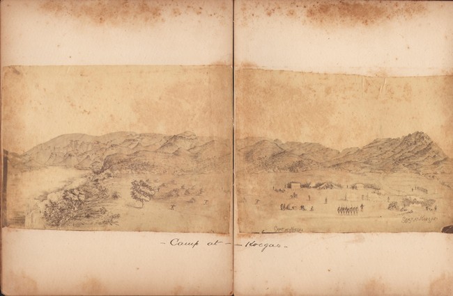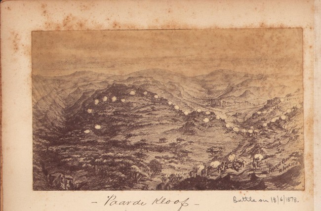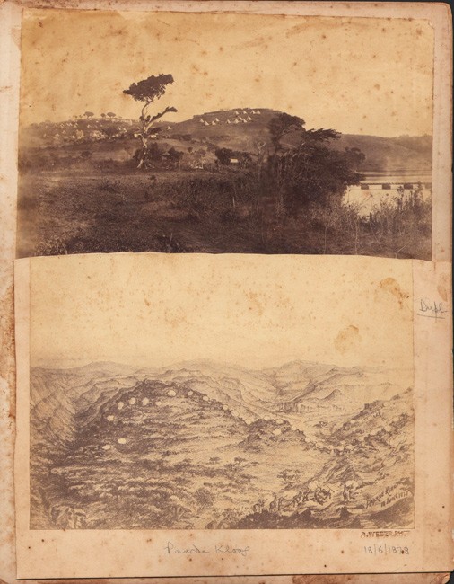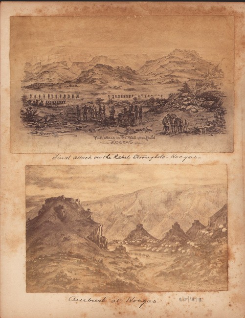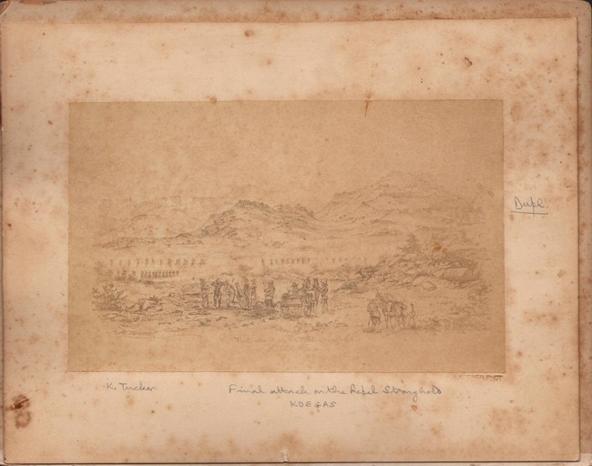 One is an original photograph depicting a camp with many tents on a hillside beyond scrub and trees. The others are photographs of hand drawn sketches one of them signed ‘K. Tucker’ and are captioned, ‘Final attack on the Rebel stronghold. Koegas.’ Two form a panorama of the ‘Camp at Koegas.’ Another shows, ‘Ambush at Koegas’ which took place on 4th May 1878 and another the ‘Final Attack on the Rebel Stronghold, Koegas.’ The final photograph of a sketch relates to the battle at Paarde Kloof on 18th June, 1878.