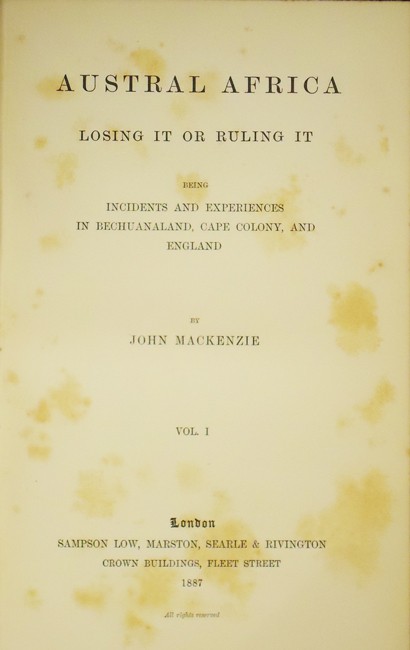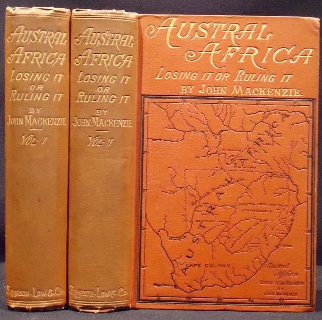 Mendelssohn (Sydney) South African Bibliography, volume 1, page 850, ‘This work affords the best detailed historical account of the events which led to the inclusion of Bechuanaland amongst the colonies of South Africa – the first step towards the retention of the hinterland of the Cape for the Empire….. The work is of voluminous nature, and it divided into six books which discuss native life in Bechuanaland, the European expansion, the proceedings of the Dutch freebooters, and the foundation and suppression of their republic, the Imperial and Colonial policies with regard to the country, Sir Charles Warren’s expedition, and many other local and colonial matters. The volumes contain a large number of illustrations, a map, and a copious index.