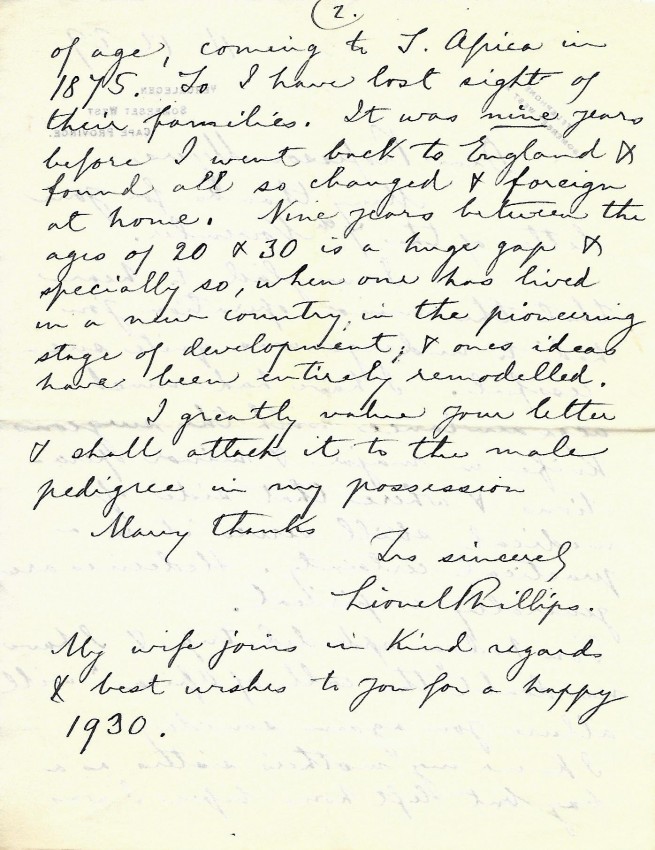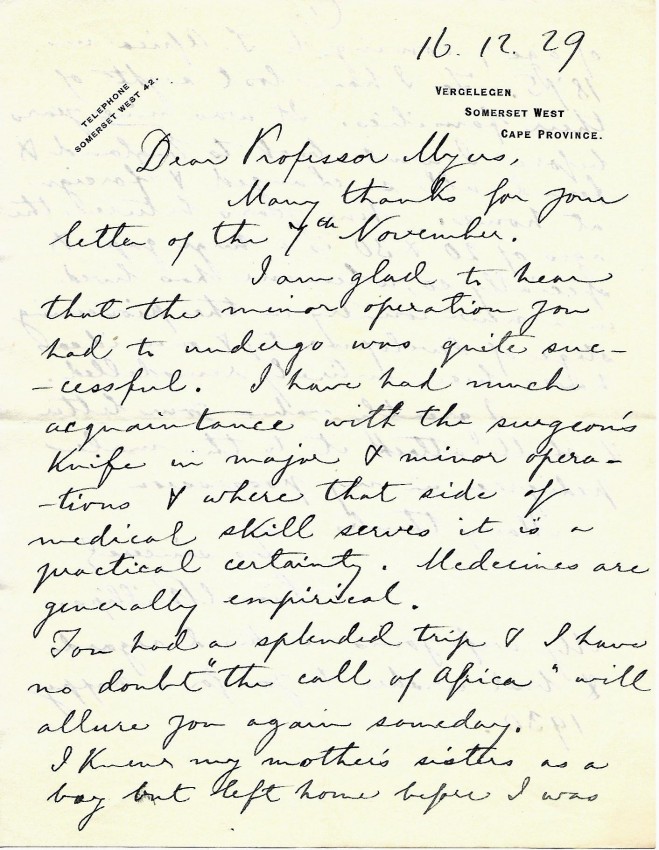 Interesting 2pp. autograph letter signed by Sir Lionel Phillips to "Dear Professor Myers" on a Vergelegen letterhead dated 16.12.29. On a single leaf 23 x 18cms. Circa 200 words. Concerning a. Recently discovered family connections in England "I knew my mother's sisters as a boy but left home before i was of age, coming to South Africa in 1875. So I have lost sight of their families. It was nine years before I went back to England,,,,,,,,,,,,,,,,,,Nine years between the ages of 20 and 30 is a huge gap & especially so, when one has lived in a new country n the pioneering stage of development, and ones ideas have been entirely remodelled." b. An operation the recipient has recently had "I have had much acquaintance with the surgteon's knife in major and minor operations and where that side of medical skill serves it is a practical certainly. Medicines are generally empirical."