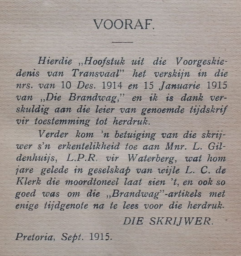 Gustav Schoeman Preller (4 October 1875 Klein Schoemansdal, Klipdrift, Pretoria – 7 October 1943 Pelindaba) was a journalist, historian, writer and literary critic. He fought for the recognition of Afrikaans. Preller helped the Afrikaner to awake to the importance of the history of South Africa. He made great contributions to the writing of South African history, through his research and the literature. He also contributed greatly to making South Africans aware of the legacy of the Voortrekkers and also played an early part in planning the Voortrekker Monument. (wikipedia.com)