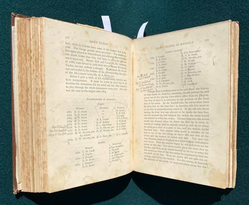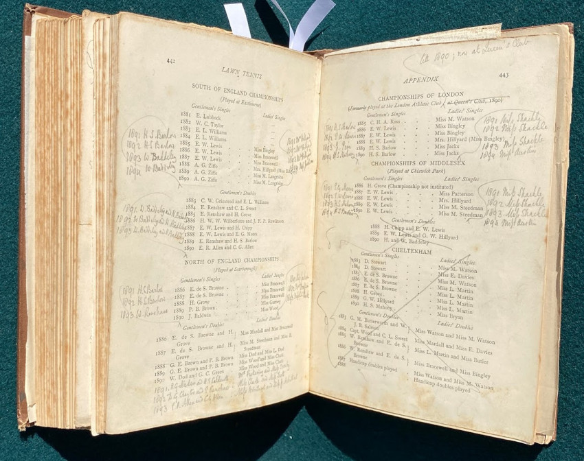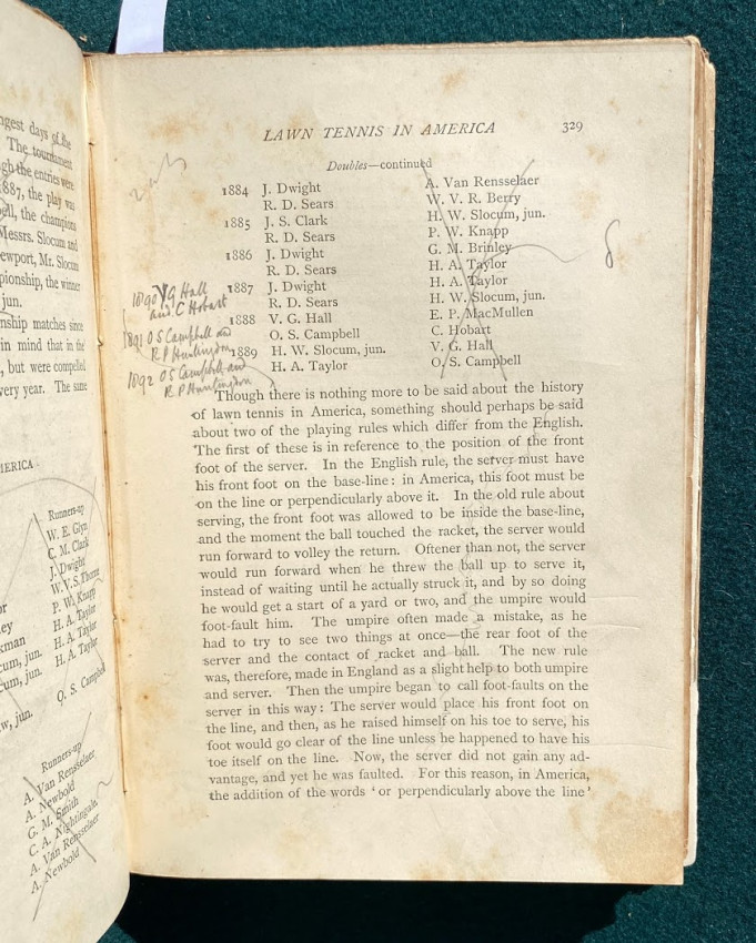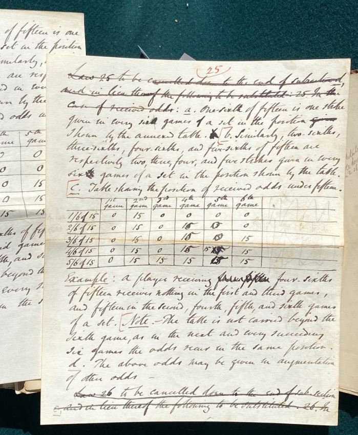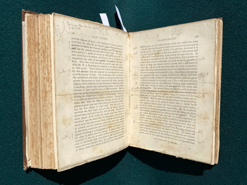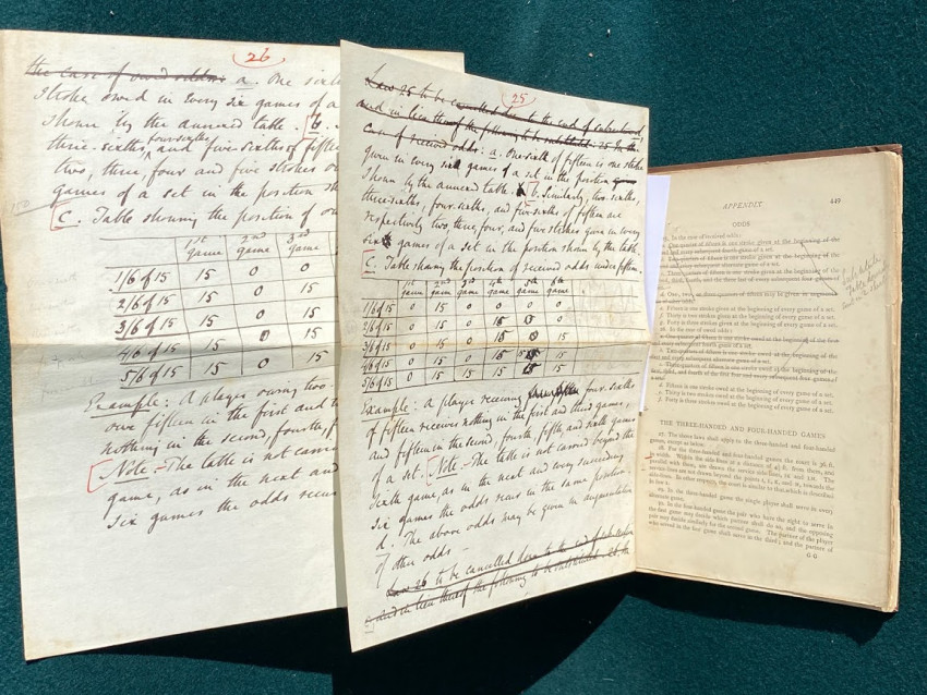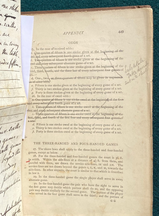 A fascinating 'incunable' of tennis. From the library of one of the founders of the modern game, with his corrections, including substantial alterations to an aspect of the game which no longer exists: the calculating of 'Odds' which was a form of handicapping.