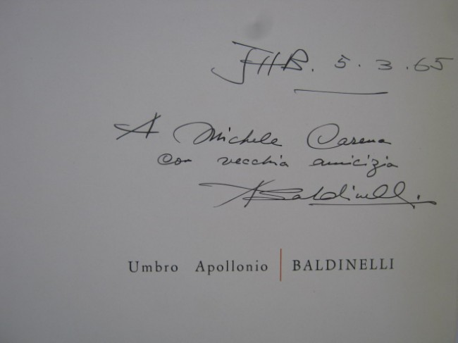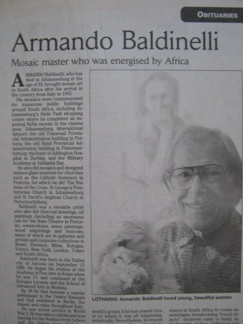 Born in Italy in 1906, Armando Baldinelli spent the last 49 of his 96 years in South Africa. Although he had already been an established artist in Italy, his South African career became even more notable. This copy is inscribed by the artist to an Italian South African friend: \"JHB. 5.3.65. A Michele Carena con vecchia amicizia. A Baldinelli\". Included are a copy of the Sunday Times obituary notice of 4 August 2002 and the notice of his requiem mass, which includes two of the artist\'s woodcuts.