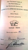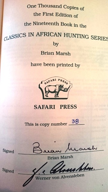 1st Limited Edition, No. 38 of 1000, 1997; Safari Press, Inc., Long Beach, California. 1997. Hardcover in Slip Case. Signed by the Author and Subject. Octavo, 7 3/4" x 9 3/4”, xix, 290pp. Tan cloth boards with black titles and leopard to front, and black titles to spine. Decorative pastedowns and endpapers. Black cloth slip case. Decorative chapter headings and page chapter title borders. Illustrated with a photograph of von Alvensleben on the half title and with 28 pages of black and white photographs.