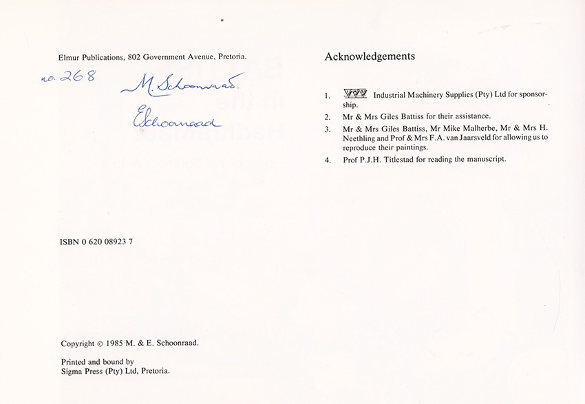 From the editor's note. It was Battiss's dream one day to publish a book about his travels in Southern Arabia to share with us the thrills of his Arabian nights – and days. And although he did not fulfil this dream, he did convey to us his exceptional attraction for the desert by means of his drawings. He once said” Who wants to talk of a lovesickness for the desert that must be thought of and felt without words, with silences for nouns and breathing for verbs.”