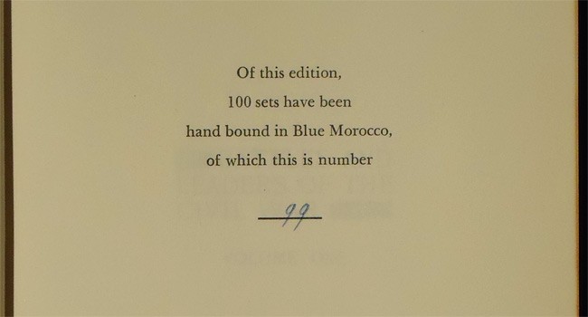 Of this edition, 100 sets have been hand bound in Blue Morocco, of which this is number 99.