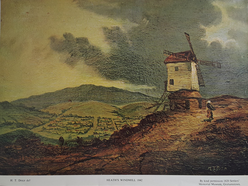 1 Print of Heath's Mill by H.T. Dold. Mr. Heath sold the mill in Grahamstown to Piet Retief in 1817.