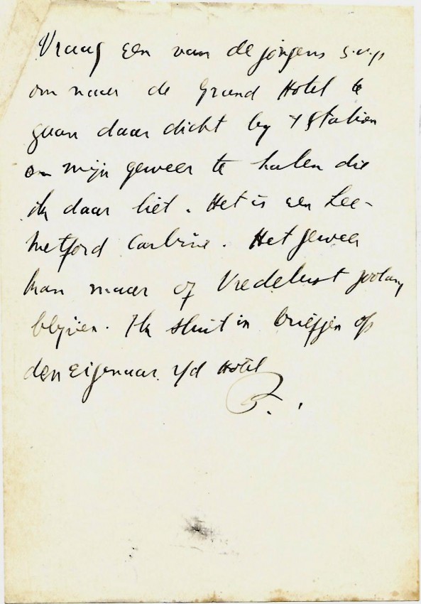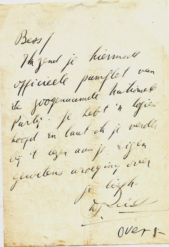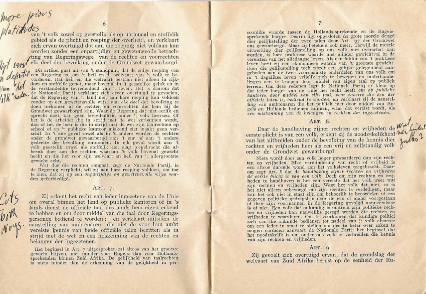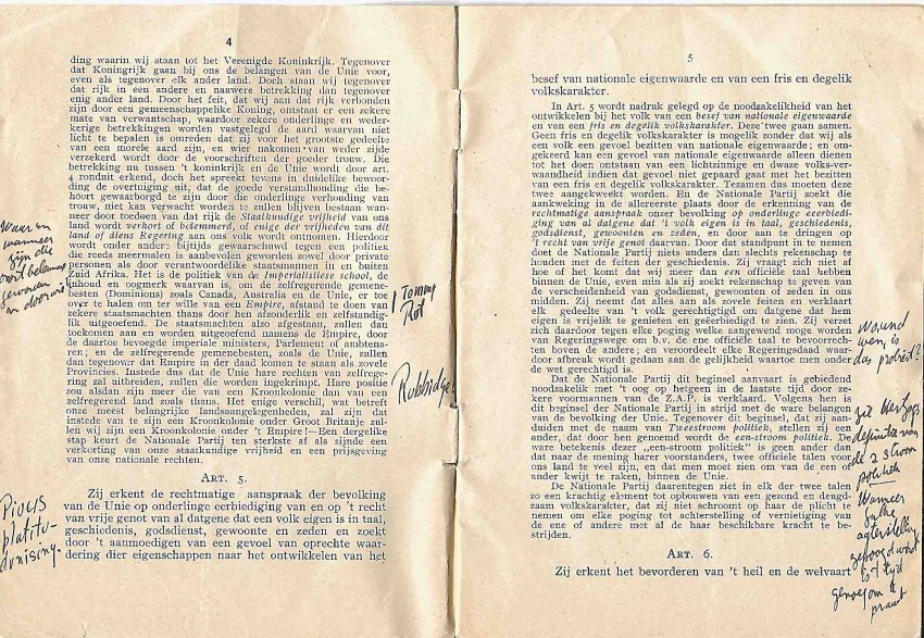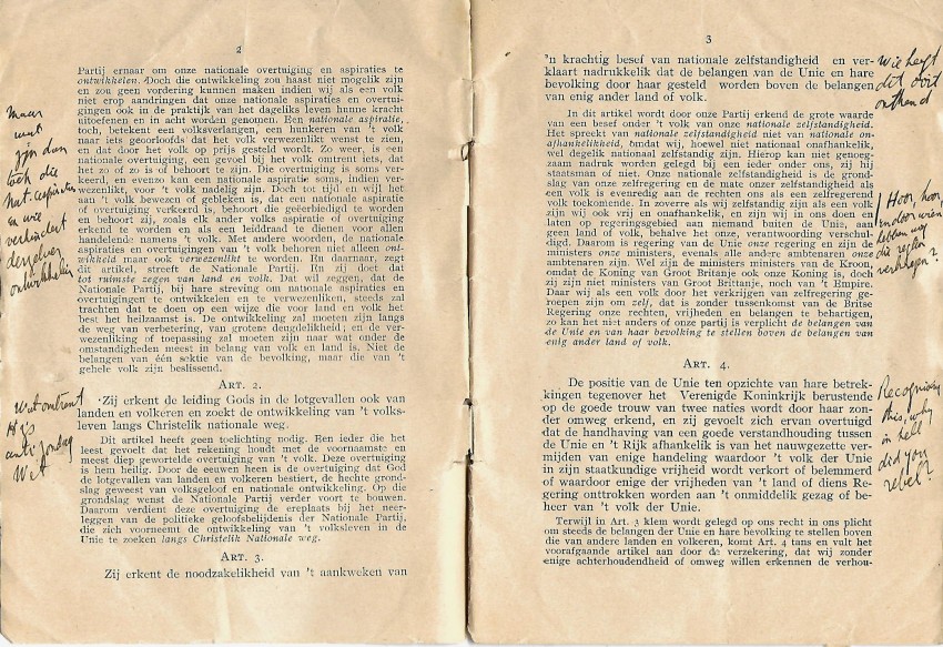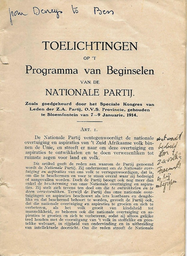 This copy was given to his sister Bess, by Deneys Reitz and has been inscribed thus in a later hand (a family descendant who inherited it): "From Deneys to Bess". There are extensive marginal critical comments (in ink) in Dutch by a member of the Reitz family (thought to be F.W. Reitz - ex President of the OFS) on the first eight pages of the document and a few, in another hand (probably Deneys Reitz) in English. Accompanying the pamphlet is a one page letter, apparently from Deneys, sending Bess the pamphlet "hiermede officiele pamflet van de zoogenoemde Nationale Partij" and requesting her opinion of it. On the verso of the letter is an addendum requesting Bess to have his gun ( a Lee-Metford Carbine?) collected for him from the Grand Hotel. Deneys Reitz, the son of Free Sate President F.W. Reitz, was a politician, soldier and author. He fought in the Boer War and the First World War. He remained in the South African Party after formation of the National Party, and was a minister in the coalition government after 1933, when the SAP and NP joined forces. He subsequently became Deputy Prime Minister. He is probably best remembered today for his two chronicles of the Boer War and First World War, Commando and Trekking On.
