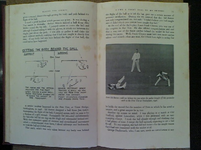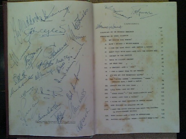 English wicket-keeper Evans\' autobiography of his cricket career during the 1940\'s, including tours to Australia, New-Zealand and The West Indies. This copy has a collection of 26 autographs on the verso of the title-page, including the likes of Jackie McGlew, T.Goddard, B.Armitage, Brian Statham, P.M.Dodds, E.B.Rowan, C.G.Burger, J.M.Cole, G.Griffin, etc... Book condition: no dust-jacket, the book now covered with red leatherette which has been stuck down, prelims and rear end-papers heavily foxed, and general foxing and finger-smudges throughout, owner inscription on f.f.e-p., binding is good.