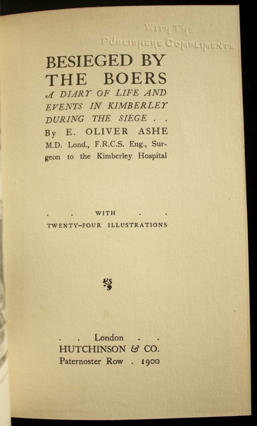 'An account of the siege and relief of Kimberley. Dr. Ashe was one of the leading surgeons in the town, and in spite of an extremely heavy practice found time to write a most interesting account of the operations of the Boers.' - Mendelssohn Vol. I, page 54