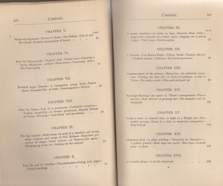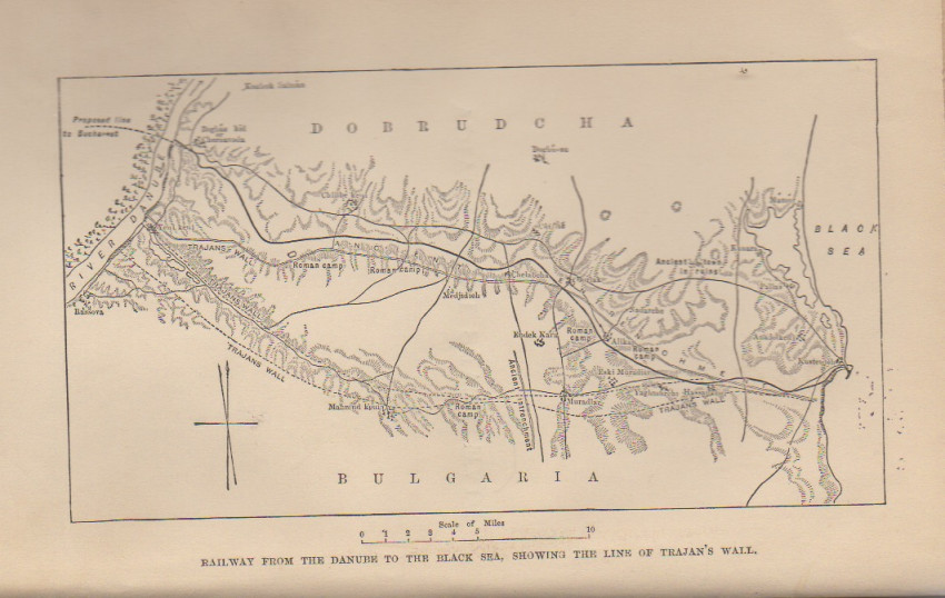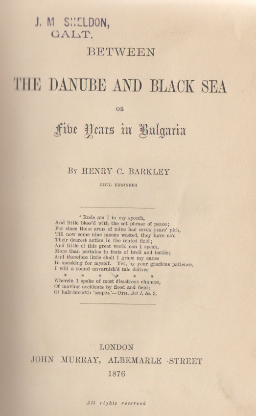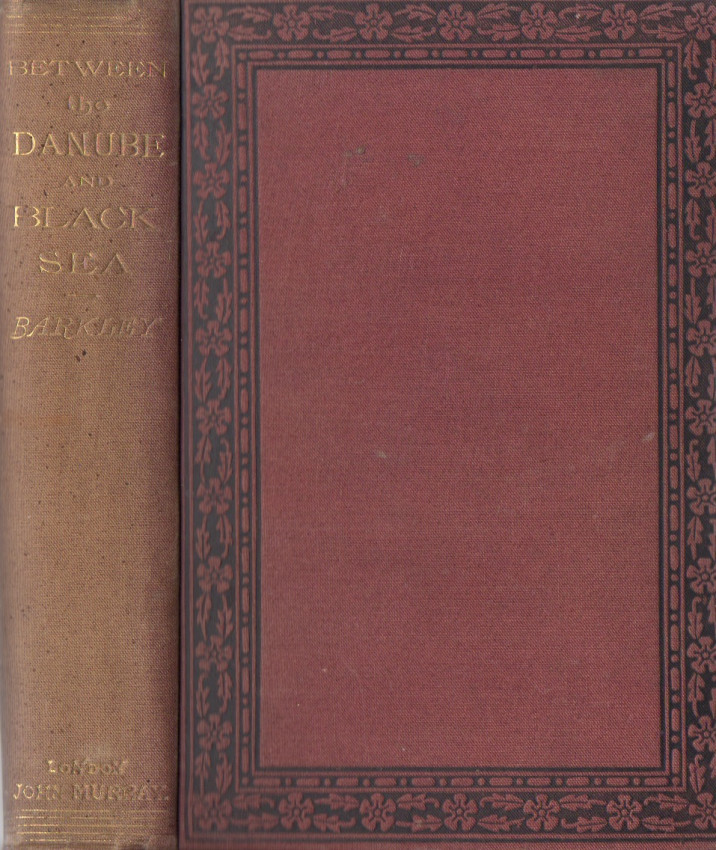 Barkley was a civil engineer hired to build a railway connecting the Danube River to Kostendje, a port on the Black Sea coast. He describes the difficulties he encountered in this wild and unsettled region, with descriptions of the terrain, the people he met, the building of the rail line, and even some hunting adventures. Original plum cloth with black foliate borders, gilt spine titles, spine a bit sunned. Map frontispiece. 313 pages + 32 page book catalog at rear. Half-title page present. Original chocolate endpapers, rear firm and tight, front with just a hint of cracking. Text block clean and tight.