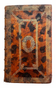 Quarter bound leather and linen boards with gilt blocking to front board, with four raised ribs to spine also with gilt lettering. Pictorial endpapers.